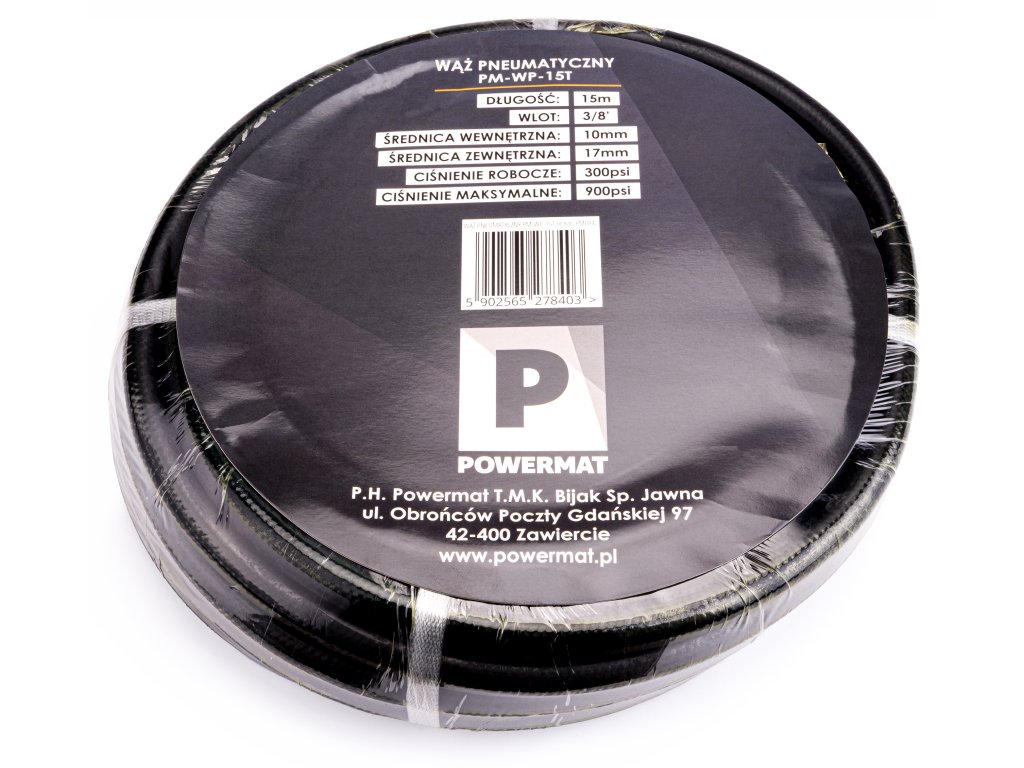 Пневматичният маркуч 10 x 17 мм / 15 м 20 бар PM-WP-15T е предназначен за бързо свързване с пневматични уреди като прави триони, компресори, боички пистолети, пневматични нитове, пневматични гайковерти, бормашини, полир машини и шлифовъчни машини. Конструиран е така, че да може лесно да се навие на барабан благодарение на своята не спираловидна конструкция. Основното му предимство е висококачествената гума, която е устойчива на масло, гъвкава и способна да издържа на високи налягания.