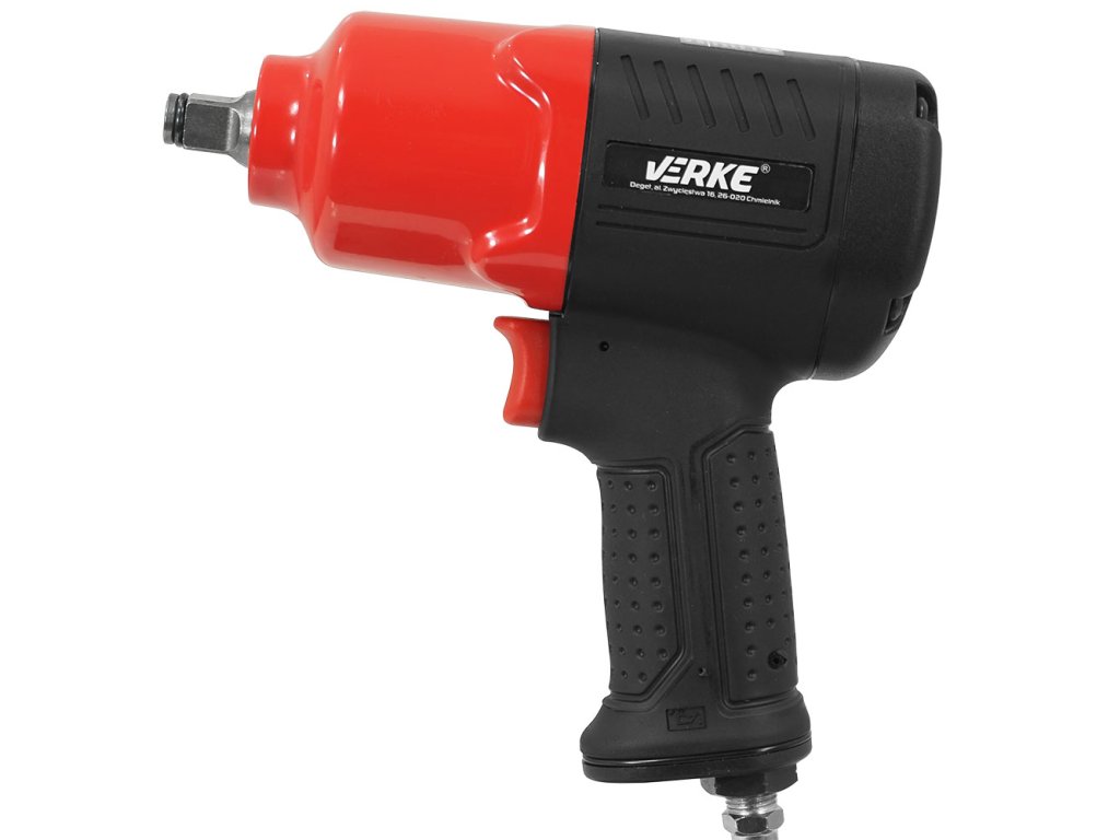 Пневматичен ударен гайковерт служи за затягане и разхлабване на болтове, гайки и други резбови монтажни елементи. Гайковертът от марката Verke е професионален инструмент, който винаги не отстъпва на работния процес. Това устройство е оборудвано с двойно ударен механизъм TWIN HAMMER. Състои се от две чукове, които се въртят около вала в затворена система. Това решение позволява постигането на огромен въртящ момент още при първите обороти на ротора, тъй като и двата чука могат едновременно да удрят от двете страни. Конструкцията с двойни пръстенови чукове се отличава с висока издръжливост и е особено подходяща за дълги работни цикли. Гайковертът е оборудван с превключвател за посоката на въртене – надясно/наляво и регулиране на въртящия момент. Това са издръжливи, мощни инструменти, на които можете да разчитате, което ви позволява да работите по-бързо и по-ефективно. Специално оформената дръжка осигурява удобна работа и пълен контрол върху уреда.