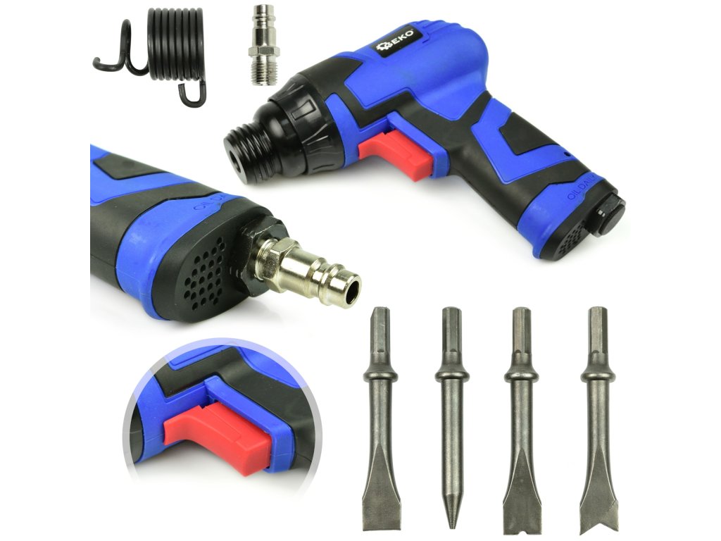 Пневматично шлосерско чукче G03147 с комплект от 4 длета е проектирано за лесно отделяне на части, свързани чрез заваряване или нитоване. Идеално за автосервизи, шлосерски и бояджийски работилници, както и отлично за домашния гараж.