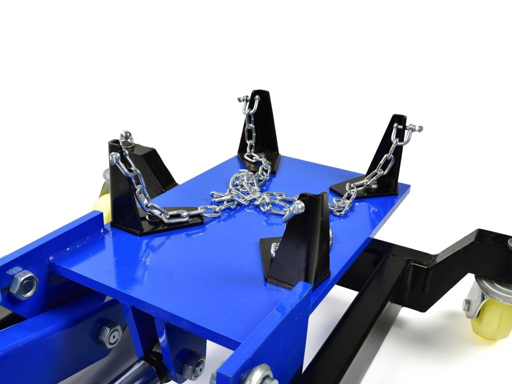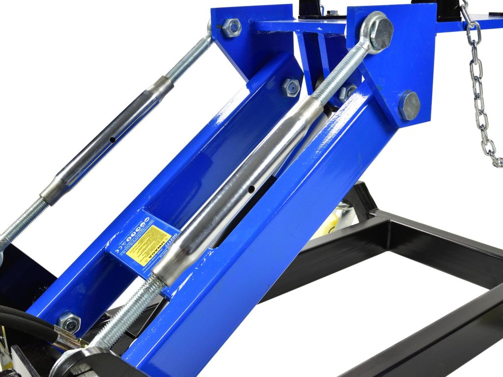 Крикът включва две винтови скоби, които позволяват регулиране на наклона на монтажната основа. Манипулацията с крика е лесна благодарение на комплект от четири въртящи се колела с лагери, изработени от полиамид. Освен това е оборудван с четири независимо регулируеми захвата и два вериги за обезопасяване на демонтирания елемент.