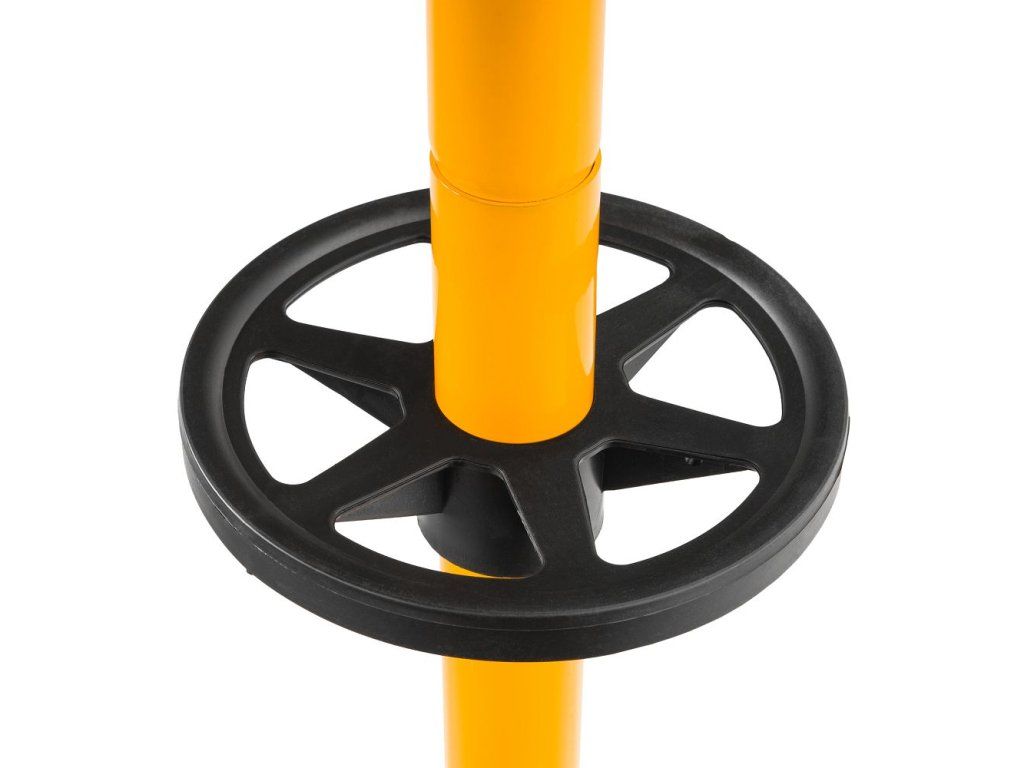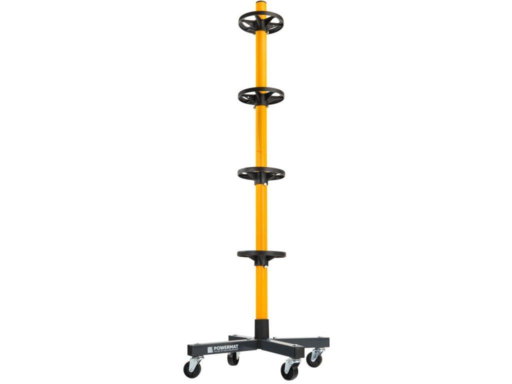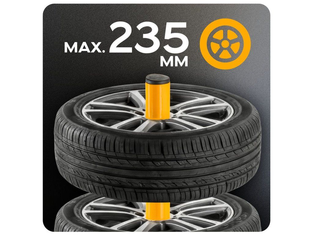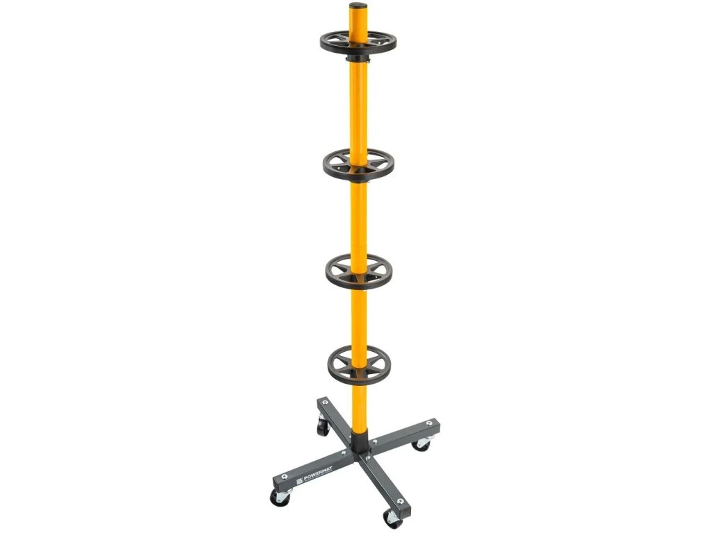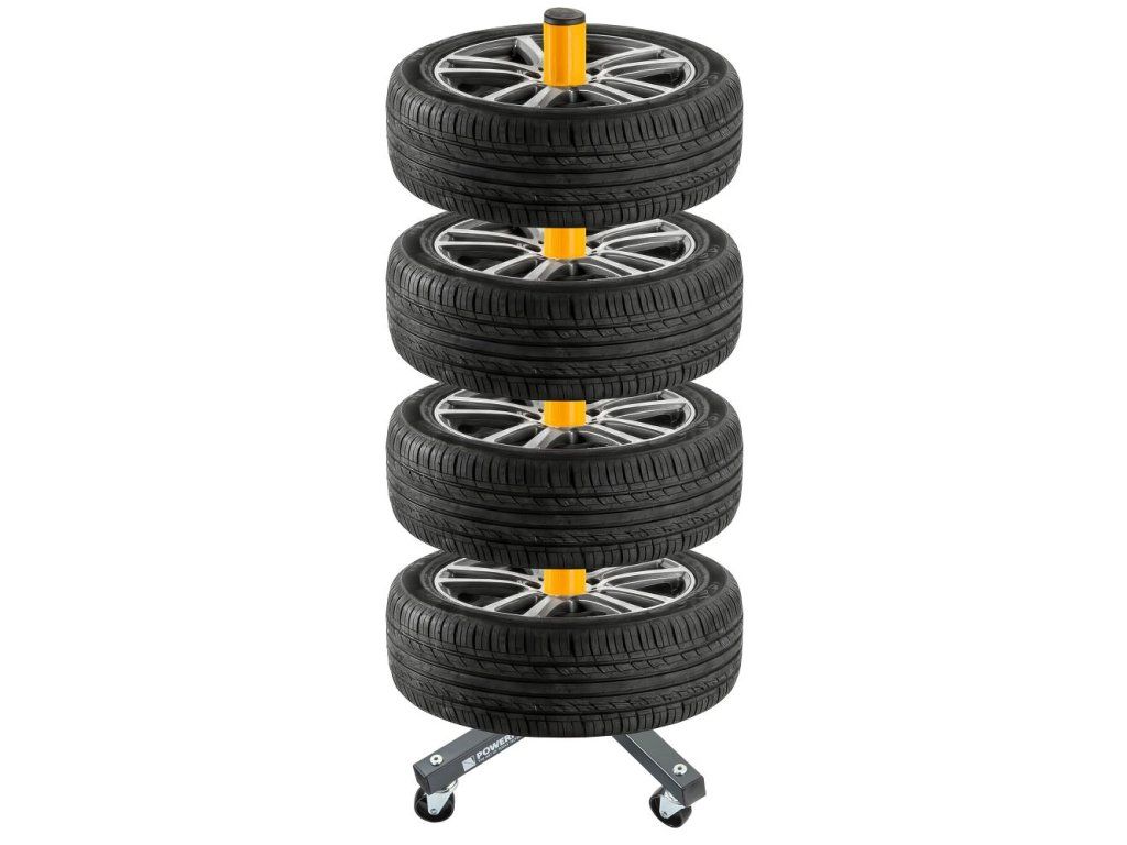 Практична стойка за автомобилни гуми е идеалното решение за подредено и безопасно съхранение на пълен комплект гуми. Позволява съхранението на до 4 гуми на едно място без риск от деформация и повреда на джантите. Благодарение на подвижната конструкция с четири колелца, можете лесно да преместите целия комплект без излишно усилие. Сгъваемият дизайн освен това спестява място в гаража или работилницата, когато стойката не се използва.