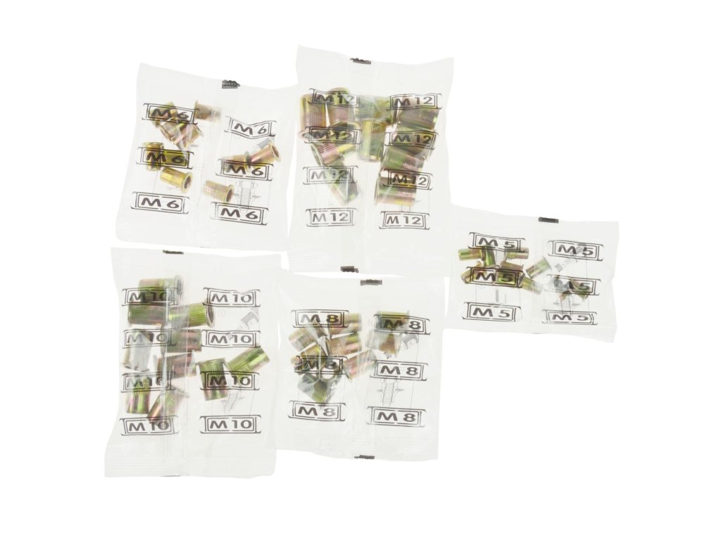 - Пълен комплект нит гайки: M5 (10 бр.), M6 (10 бр.), M8 (10 бр.), M10 (10 бр.), M12 (10 бр.)
