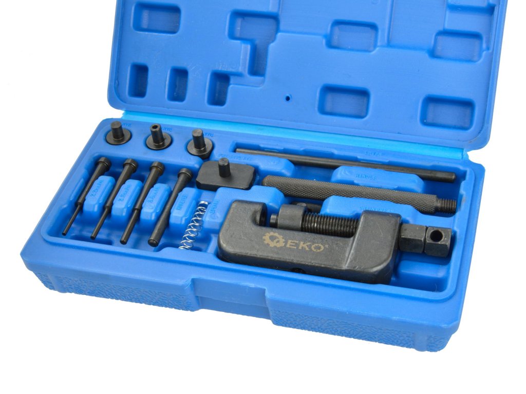 Този комплект е подходящ за вериги с размери от 25 до 630. За вериги с размери 530 и 630 е необходимо предварително да се изшлайфа главата на пиновете за улесняване на работата.