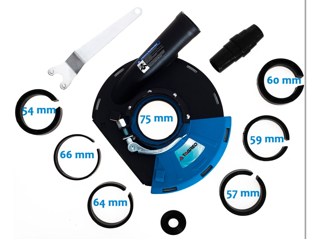 Устройството се монтира лесно на фланеца на шпиндела вместо стандартния метален предпазител, осигурявайки плътно и здраво свързване с ъглошлайфа. По време на работа гарантира стабилно и ефективно засмукване на праха с почти 100 % ефективност.