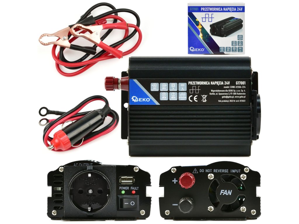 Преобразувател на напрежение 24V/230V 250/500W G17001 е идеалният спътник за вашите пътувания. Този преобразувател превръща постояннотоковото напрежение от 24V от батерии и автомобилни инсталации в променливотоково напрежение от 230V. Позволява захранването на електронни уреди, изискващи 230V. Уредът има постоянно мощност 250W и максимална пикова мощност 500W. В комплекта е включен здрав кабел с щепсел, съвместим с автомобилния запалвач.
