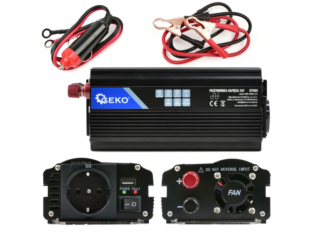 Преобразувател на напрежение 24V/230V 500/1000W G17005 е незаменим съюзник при пътувания, който преобразува прав ток 24V от батерии и автомобилни инсталации в променлив ток 230V. Така можете да захранвате електронни устройства, изискващи напрежение 230V. Този преобразувател предлага постояннота мощност от 500W и пикова мощност до 1000W. В комплекта е включен здрав кабел с конектор, подходящ за автомобилен запалител.