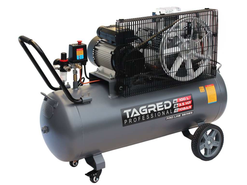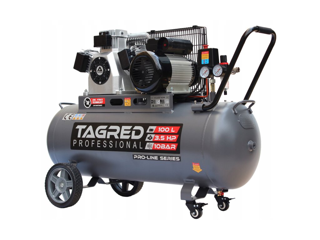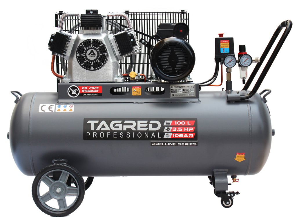 Професионален безмаслен компресор 10 BAR 100L, 3 бутала, мощна машина от серия TAGRED PRO-LINE представлява ново ниво на работа, безопасност и комфорт. Неговите удобни и потребителски приятелски характеристики го правят идеален избор за всички случаи, където сгъстеният въздух не трябва да бъде замърсен с масло.