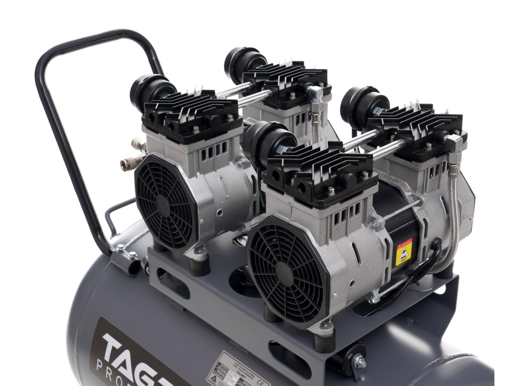 Професионален безмаслен компресор 10 BAR 100L 4 бутала 4Т, тих е високоефективно устройство, което се отличава с комфорт при работа, безопасност и лесна употреба. Този модел е идеален там, където е наложително стиснатият въздух да не бъде замърсен с масло, което включва стоматологични, хранителни и фармацевтични производства, както и домашна употреба. Компресорите TAGRED се характеризират с по-тиха работа, по-компактни размери и по-ниско тегло, което гарантира по-висока мобилност в сравнение с традиционните маслени компресори.