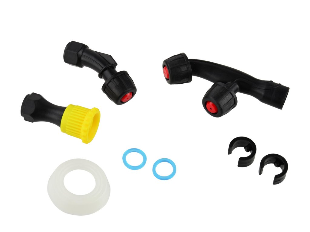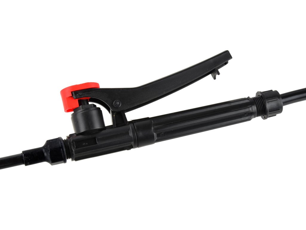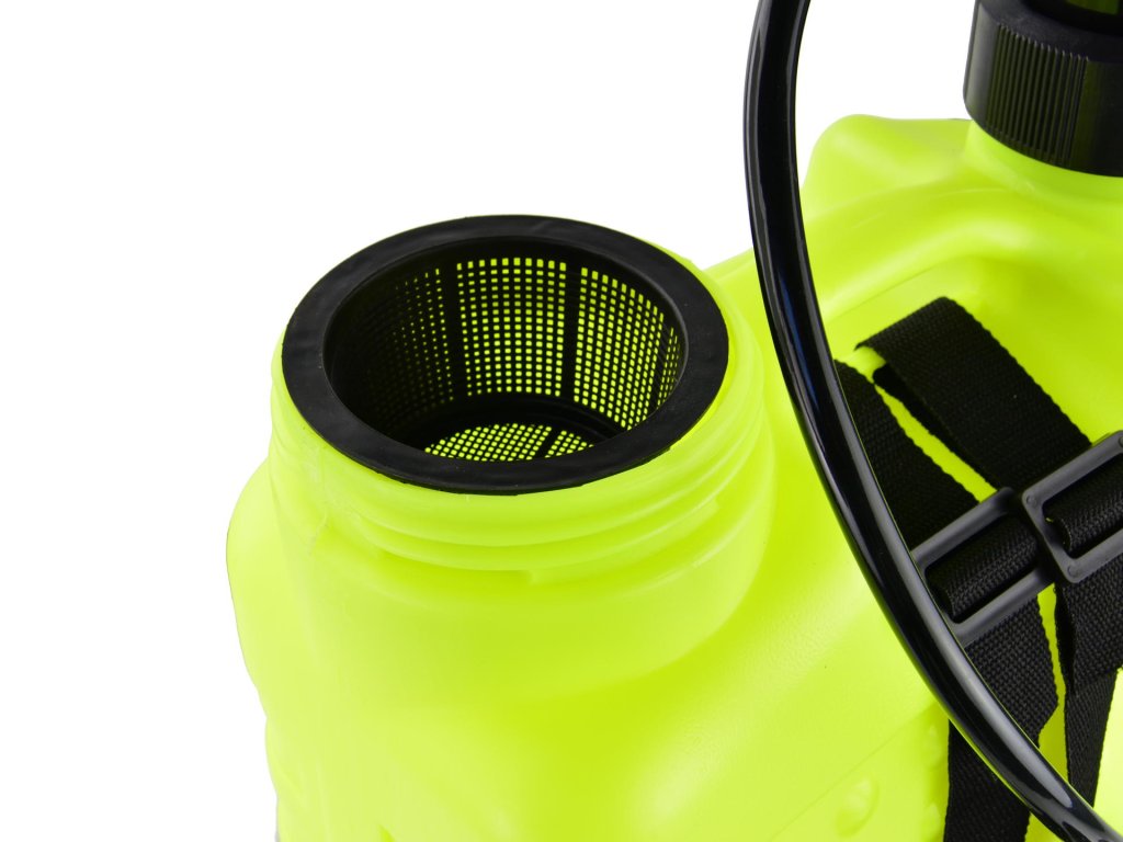 Сред основните ѝ характеристики са удобни презрамки за носене на гръб, осигуряващи комфорт при продължителна употреба. Комплектът включва 3 различни накрайника за пръскане, което позволява адаптиране на разпръскването според нуждите. Дръжка с функция за блокиране улеснява непрекъснатото пръскане без необходимост от постоянно стискане. Пръскачката е оборудвана с резервоар с филтър за пълнене и издръжлив полиетиленов корпус, гарантиращ дълъг експлоатационен живот и устойчивост на химикали. PVC маркуч и дръжка с дължина 48 см осигуряват лесен достъп и гъвкавост при работа.