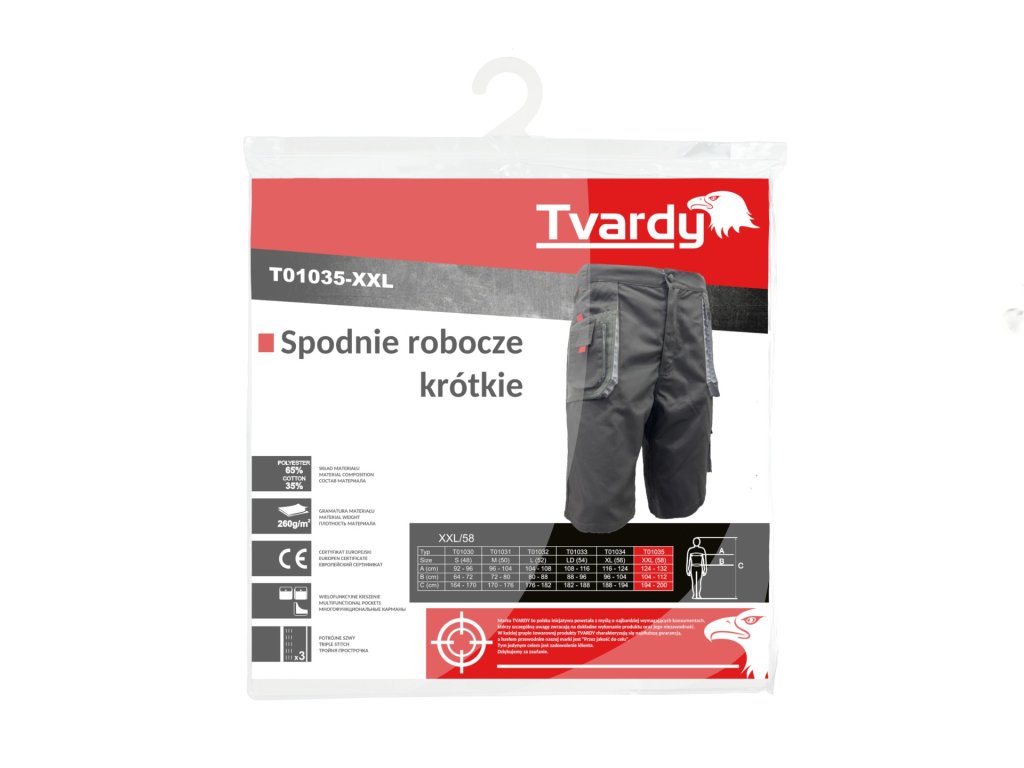 Работни къси панталони TVARDY размер XXL T01035-XXL са удобни и издръжливи, идеални за топлите дни. Тези леки къси панталони са изработени от висококачествена смес от полиестер (65%) и памук (35%), което осигурява устойчивост на замърсяване и намачкване.