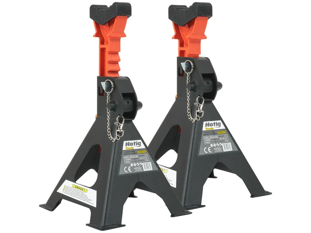 Този комплект от стойки за автомобил с носимост до 3 тона включва 2 броя и е произведен с високо качество. В комплекта е включена гумирана подложка, която осигурява стабилност и защита на повърхността. Стойките разполагат с щракващо заключване за регулиране на височината и заключващ клин за повишена безопасност.