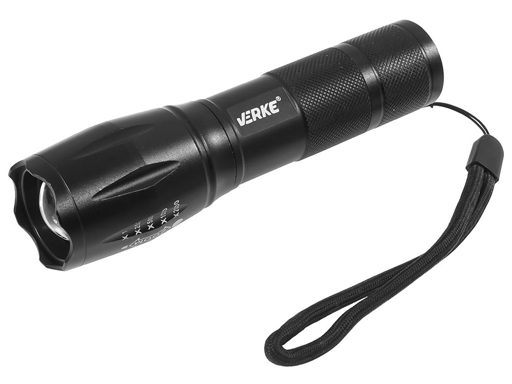 Този универсален ръчен фенер с увеличение VERKE V87508 с светлинен поток 1000 лумена и захранване с Li-ion акумулатор 18650 с капацитет 3500 mAh или тънки батерии 3x1,5V/AAA е идеален за различни дейности. Фенерът е оборудван с изключително ефективен Cree XML-T6 диод, което осигурява по-голям светлинен интензитет при дълъг период на работа. Разполага с 5 режима на работа: 100%, 50%, 25%, мигане и SOS, както и с леща, която произвежда равномерен светлинен сноп и възможност за плавно регулиране на фокуса на светлината. Корпусът на фенера е произведен чрез CNC технология от аеролий 6063. Повърхността е преминала през анодизиращ процес, устойчив на износване.