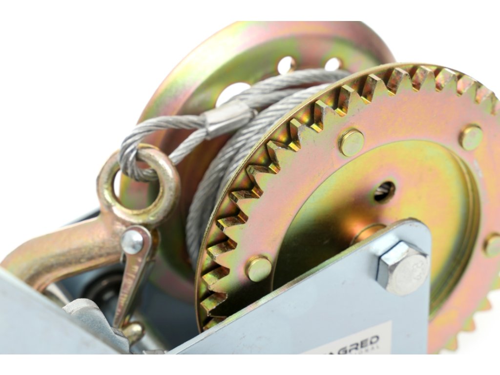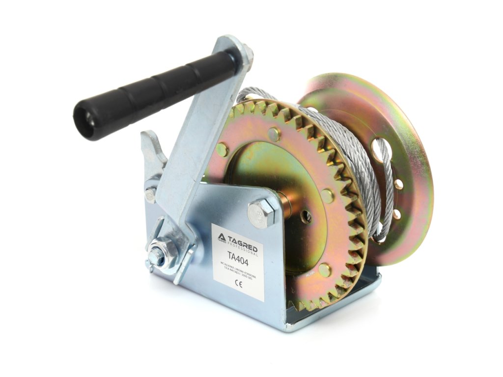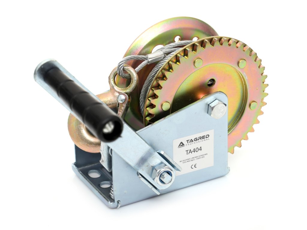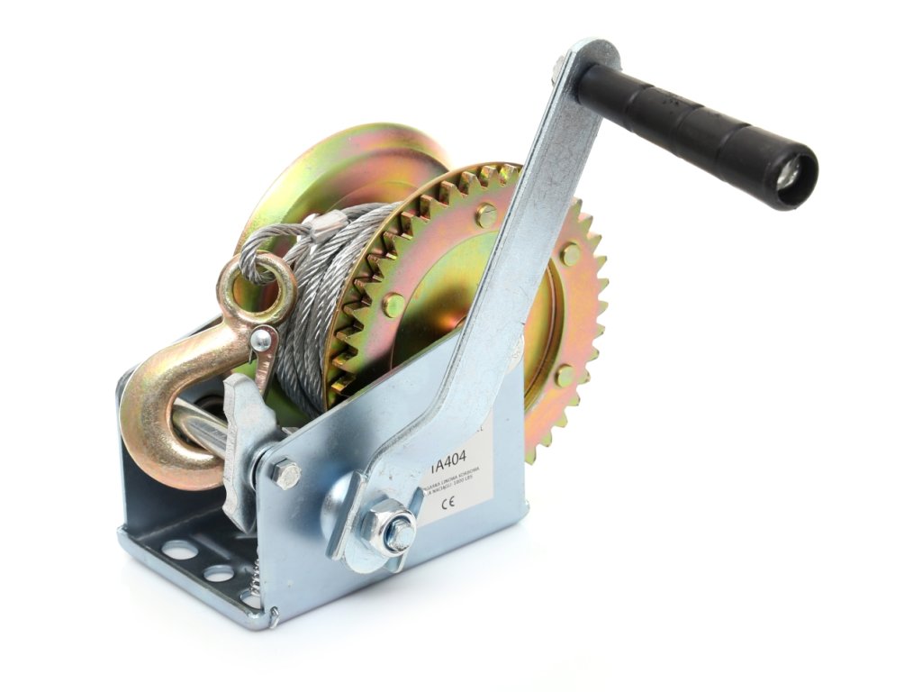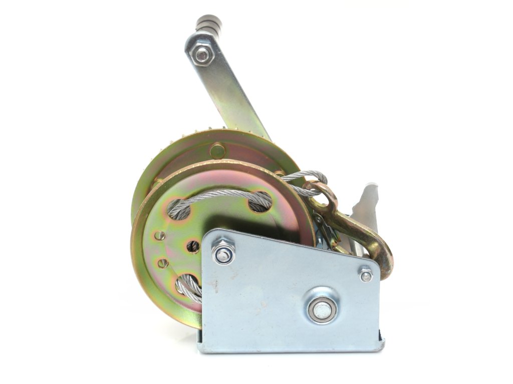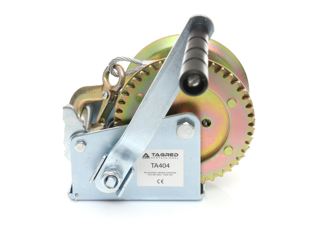 Ръчна лебедка с дръжка, въже, 453 кг, 1000 lbs, въже 10 м е висококачествен инструмент, изработен от здрав конструционен метал. Отлятият кука е оборудван с пружинен спирачен механизъм, който гарантира максимална безопасност при употреба. Управлението на лебедката е много лесно благодарение на ръчното колело и крик механизма, които осигуряват удобно повдигане и спускане на товари. Този инструмент е идеален за опъване, връзване, закрепване и преместване на тежки и обемисти предмети.