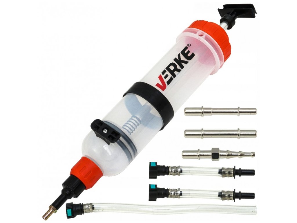 Ръчна помпа за изсмукване 1,5 л Verke V86340 – подходяща за изтегляне на масло и други течности, като спирачна течност. Незаменим инструмент във всеки автосервиз. Предназначена за засмукване и подаване на масла и течности в труднодостъпни места. Буталото е оборудвано с уплътнение от висококачествен каучук, устойчиво на продължително въздействие на смазочни материали и масла. Капацитет 1,5 л.
