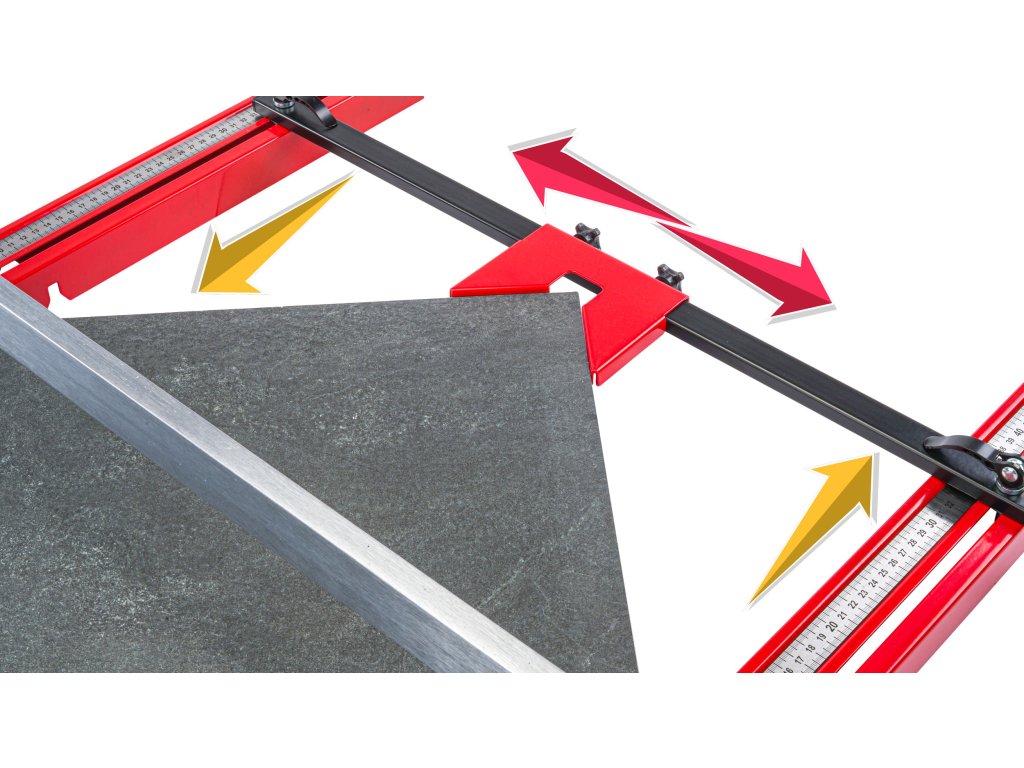 - Допълнителни опори и рамена с дължина 60 см: Резачката разполага с допълнителни опорни релси за повишена стабилност при рязане на големи и тежки плочки, а рамото с дължина 60 см и принадлежност за рязане под ъгъл 45 градуса увеличава функционалността и възможностите за работа.