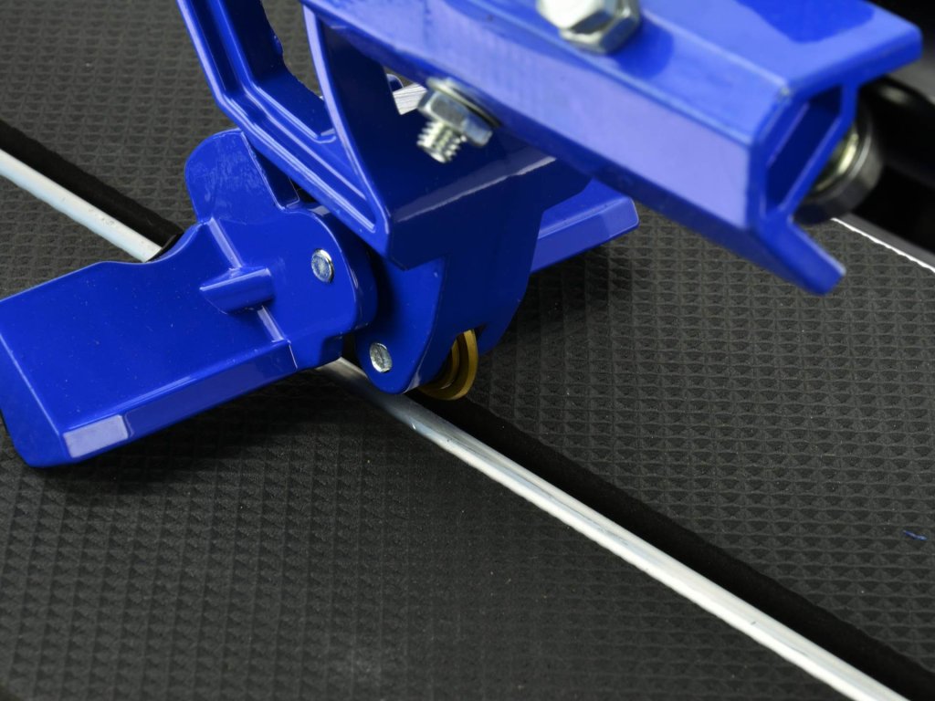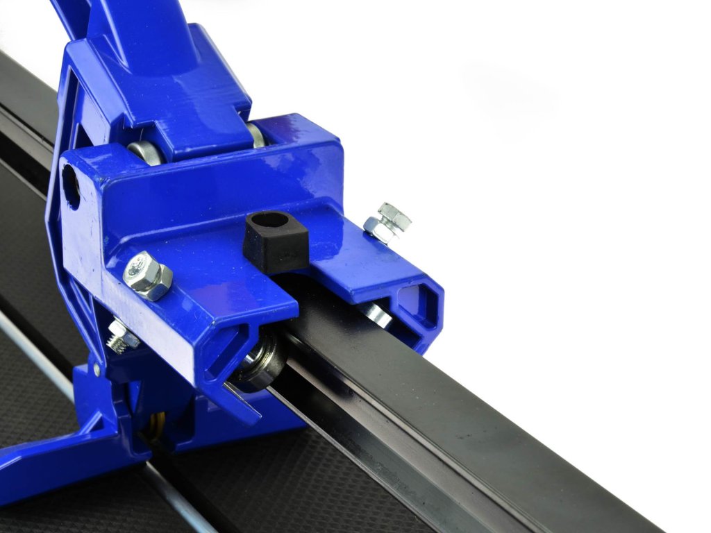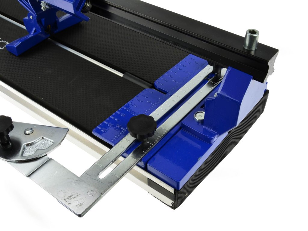 Здравоначертана водачна шина с режещ механизъм на лагерни топчета осигурява изключителна точност при рязане на плочки с дебелина до 16 мм. Прецизното измерване на разреза се гарантира от метална линия с възможност за настройка на ъгъла на рязане от 0° до 60°. Алуминиевата основа с гумени крачета осигурява стабилност и безопасност по време на работа.