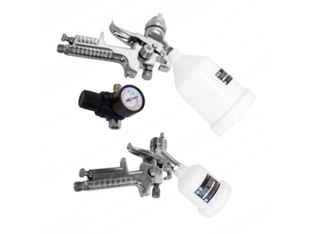 Професионален комплект пистолети за боядисване с регулатор на налягането е подходящ за всички видове бои и осигурява отлични резултати при боядисване. Намира приложение в автосервизи, бояджийски цехове, работилници и други обекти.