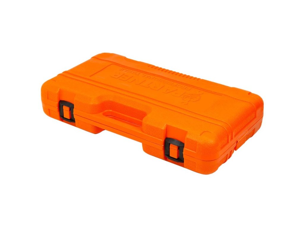 Професионален комплект ударни ключове 3/4" + 1". Идеален за големи камиони и селскостопански машини, изработен от здрави материали, което се отразява на тяхната издръжливост. Незаменим във всеки автосервиз — ударните вложки с този размер ще помогнат при ремонти на камиони или селскостопански машини. Идеално за разхлабване или затягане на големи болтове. Всички камъни и редуктори са съхранени в практична кутия. Комплектът съдържа 26 части. Кутията осигурява безопасен транспорт и предотвратява самоволно отваряне.