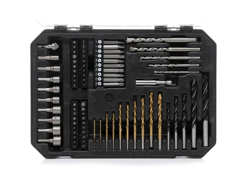 Комплектът съдържа шестограмен набор от ключове в размери 5–13 мм и пълен комплект битове, включително плоски, кръстати PH, PZ, квадратни, инбусни и Torx. Всички са изработени от CrV стомана и допълнително закалени. Стандартното захващане 1/4 инча позволява използване с всеки електрически отвертка или бормашина.