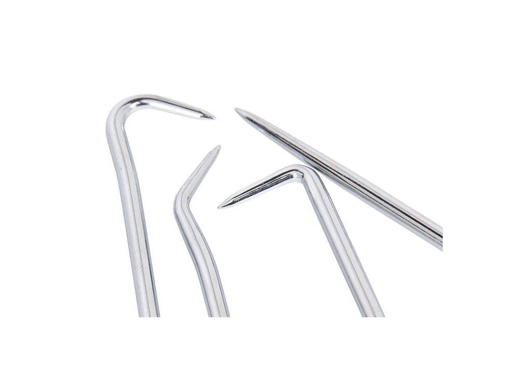 Острите върхове на куки, включени в комплекта, са закалени и хромирани, което им осигурява не само изключителна издръжливост, но и устойчивост на корозия. Благодарение на използването на еластична стомана тези куки са изключително дълготрайни и ефективни в различни работни условия.