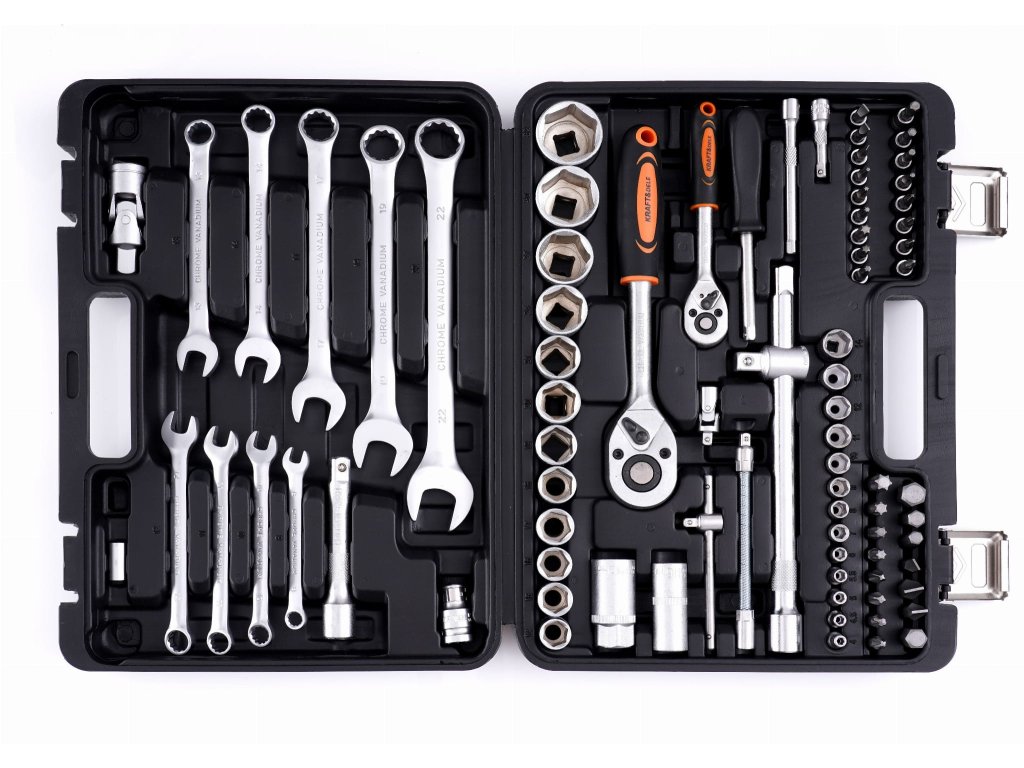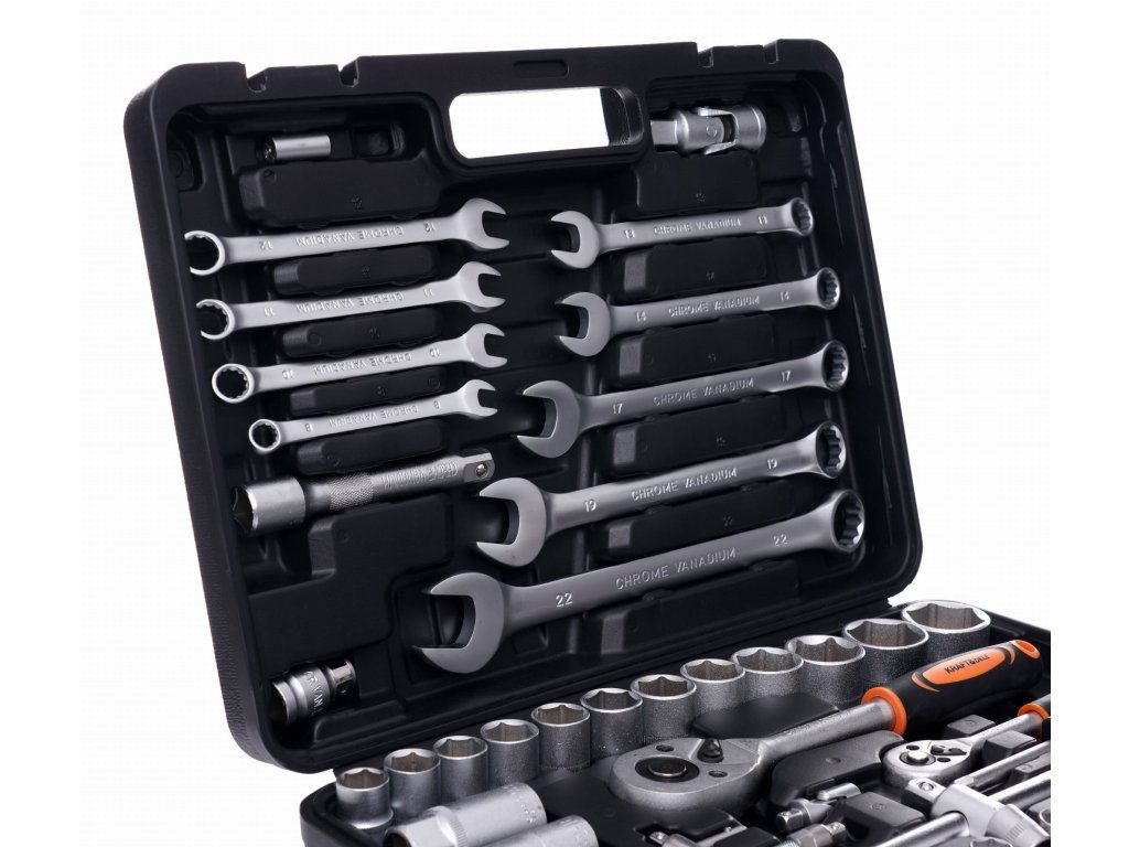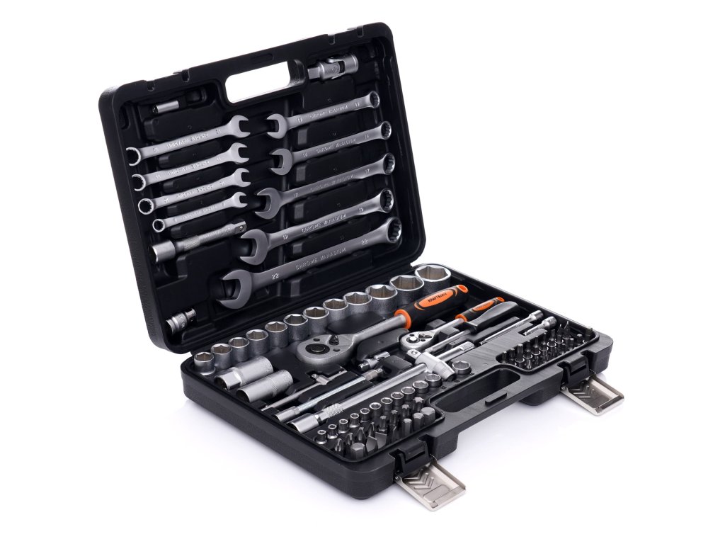 Комплектът съдържа 82 части. Всеки от тях е изработен от висококачествена стомана, което позволява използването на инструментите и при задачи, изискващи голяма сила, без да се повредят.