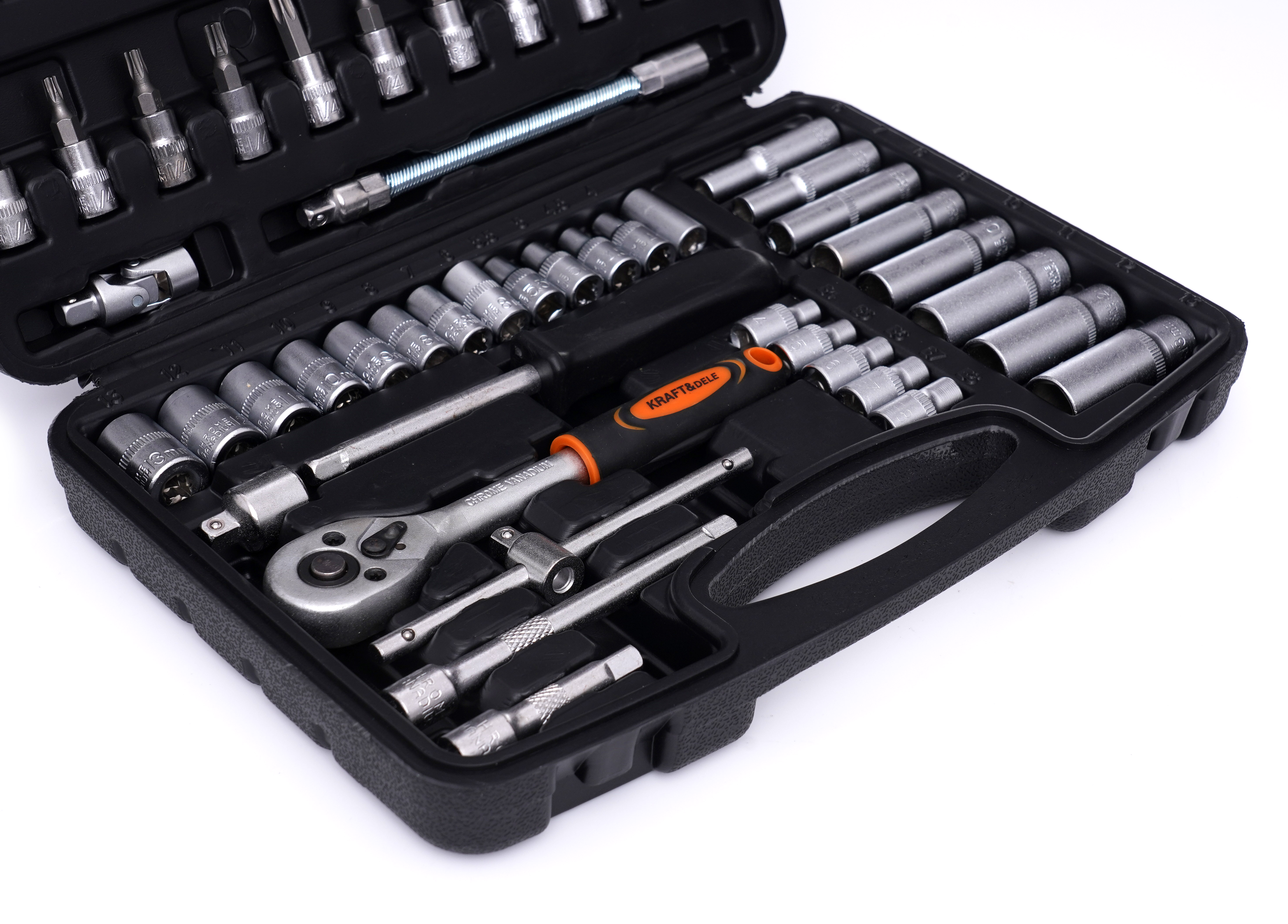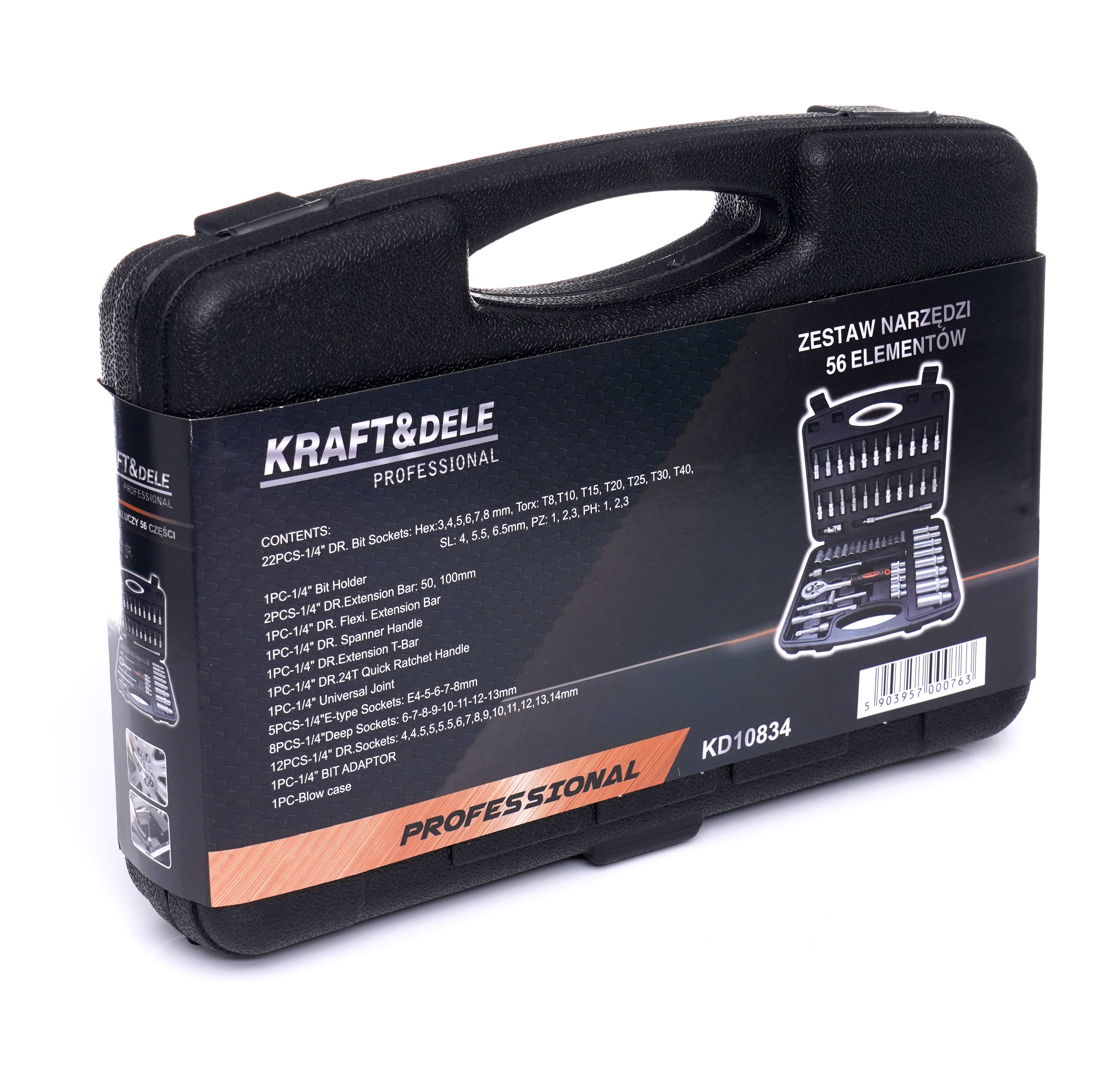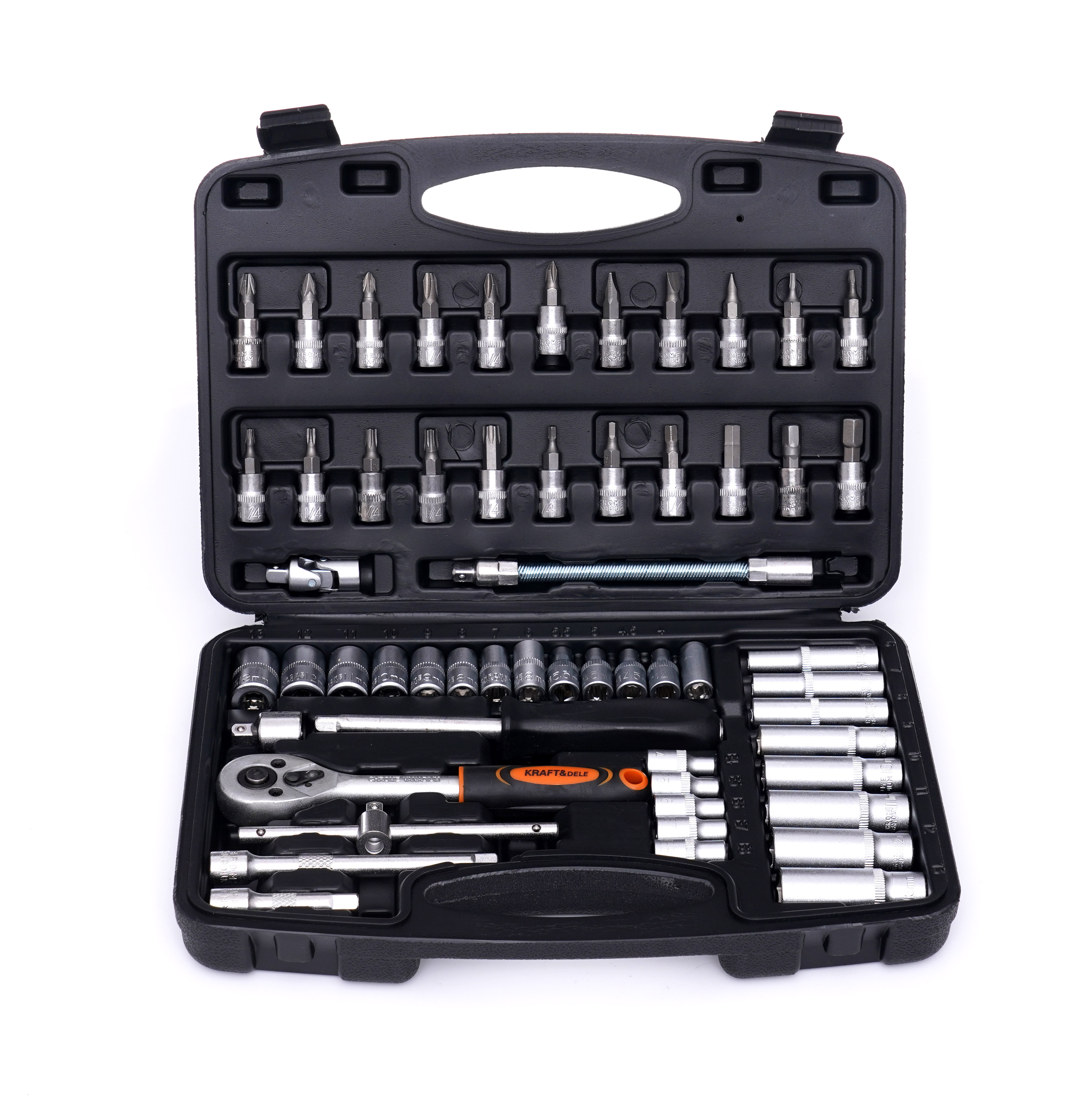 Изключително обширен комплект инструменти на марката Kraft&Dele с обозначение KD10834. Инструментите се характеризират с качествена изработка, издръжливи материали и практичен калъф, в който всеки инструмент има своето място.