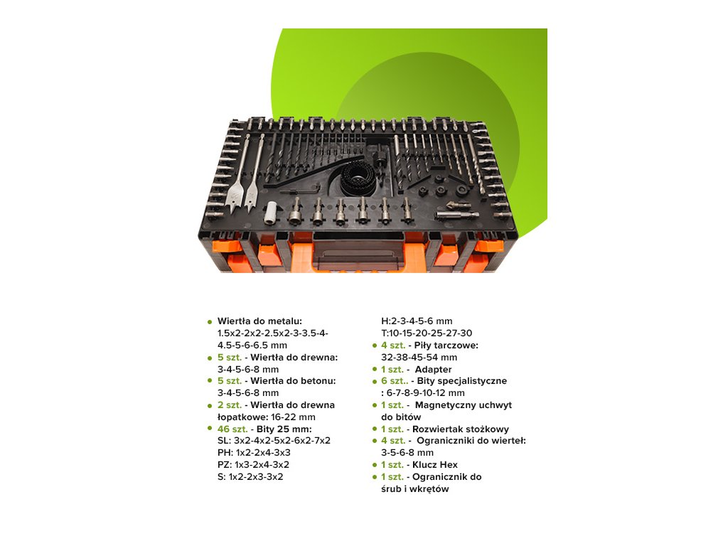 - 46 бр. битове 25 мм: SL 3-4-5-6-7, PH 1-2-3, PZ 1-2-3, S 1-2-3, H 2-3-4-5-6 мм, T 10-15-20-25-27-30