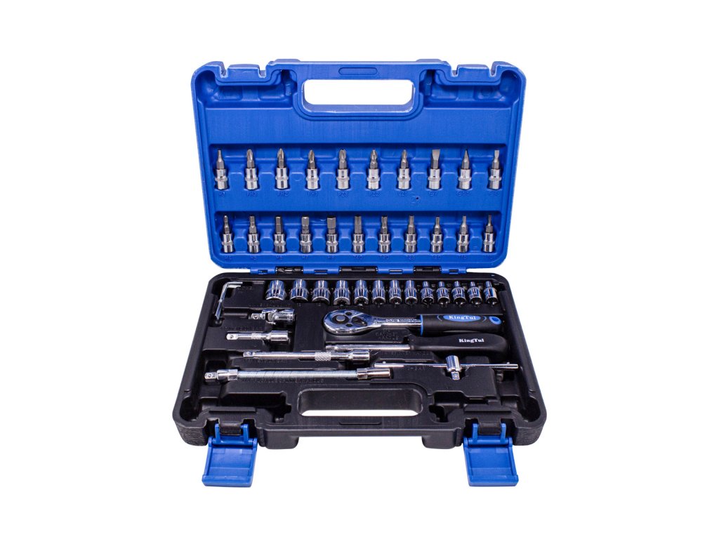 Комплектът включва тресчотка с издръжлив храпов механизъм. Комплектът съдържа богат избор от вложки (размери от 4 до 14 мм), накрайници за свещи, битове (плоски, кръстати, шестограмни, Torx). Допълват ги удължители (включително гъвкав), универсална става, шестограмни ключове, Т-образна дръжка и държач за битове. Всичко е подредено в практична кутия. Комплектът е чудесен както за професионална, така и за домашна употреба. Професионалното производство и закалената хром-ванадиева стомана осигуряват здравина и издръжливост. Всички размери са обозначени за удобство на потребителя.