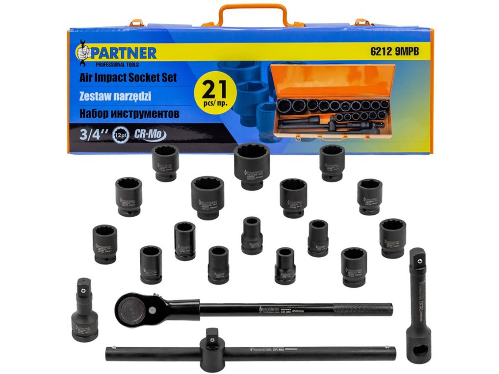 - 3/4" 12-странни ударни вложки: 17, 19, 21, 22, 24, 27, 30, 32, 34, 35, 36, 38, 41, 46, 50 мм