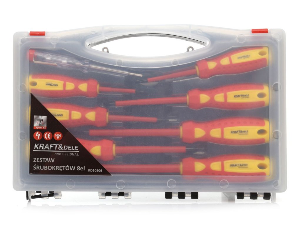 Комплект отвертки 8 части KD10906 от Kraft & Dele ще се окаже полезен във всяка работилница или гараж. Включен е тестер за напрежение 100-250 V. Приложеният кейс улеснява съхранението на отвертките.