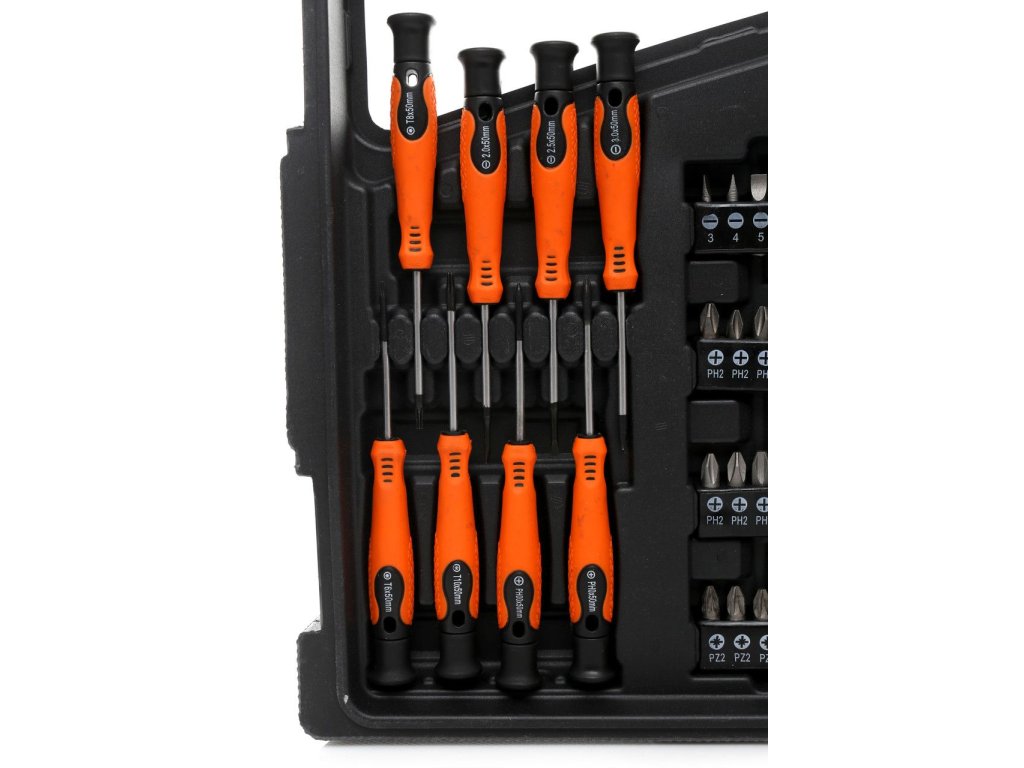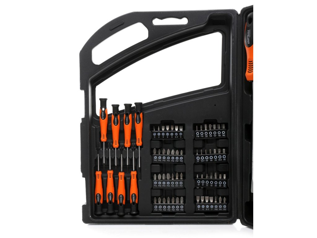 Използването на висококачествени материали при производството на отвертки и битове удължава тяхната дълготрайност. Комплектът съдържа 75 бр.