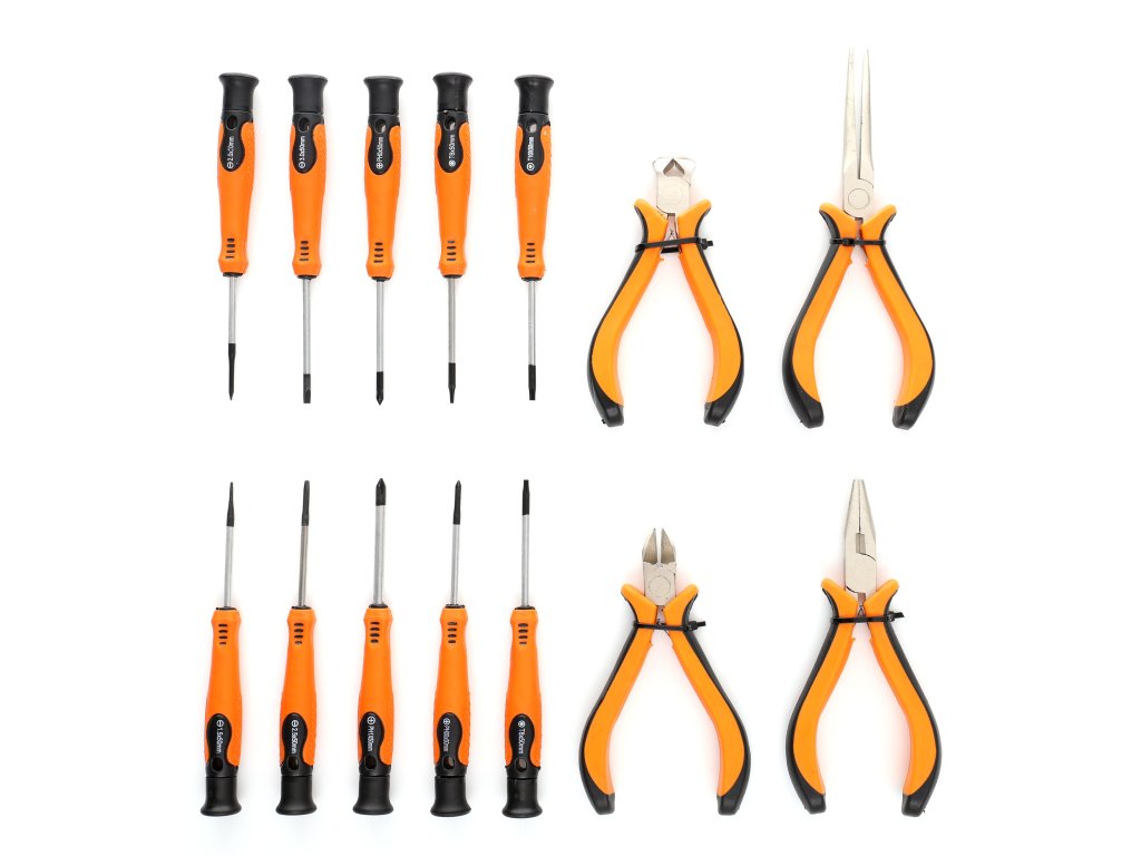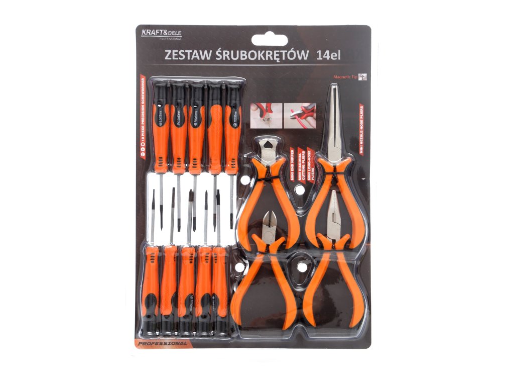 Използването на висококачествени материали при производството на отвертките и клещите удължава техния живот. Комплектът съдържа 14 части.