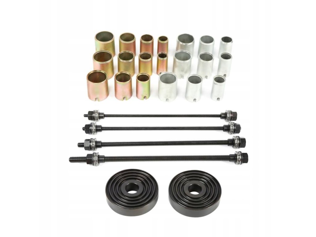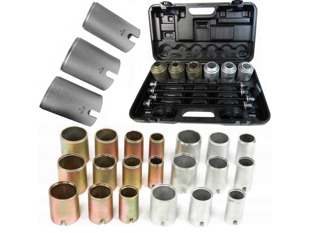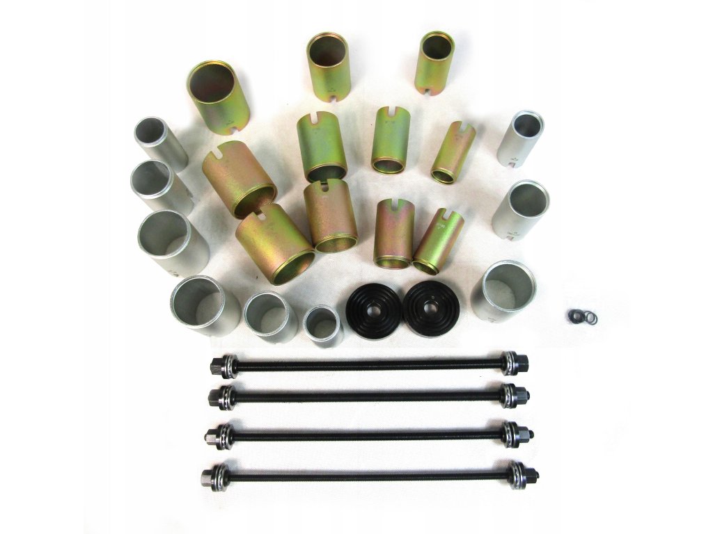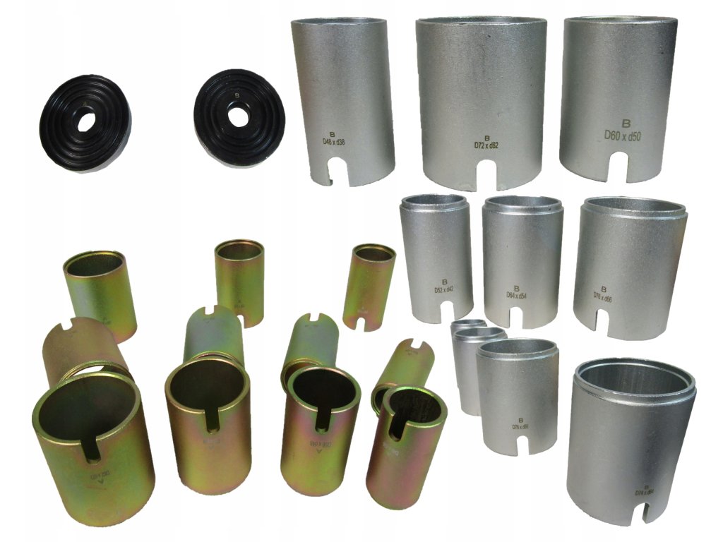 Комплект за запресоване/избиване на метално-гумени втулки на автомобил, без да е необходимо разглобяване на рамената. Комплектът може да се използва с хидравлична преса или с помощта на проходен теглещ цилиндър.
