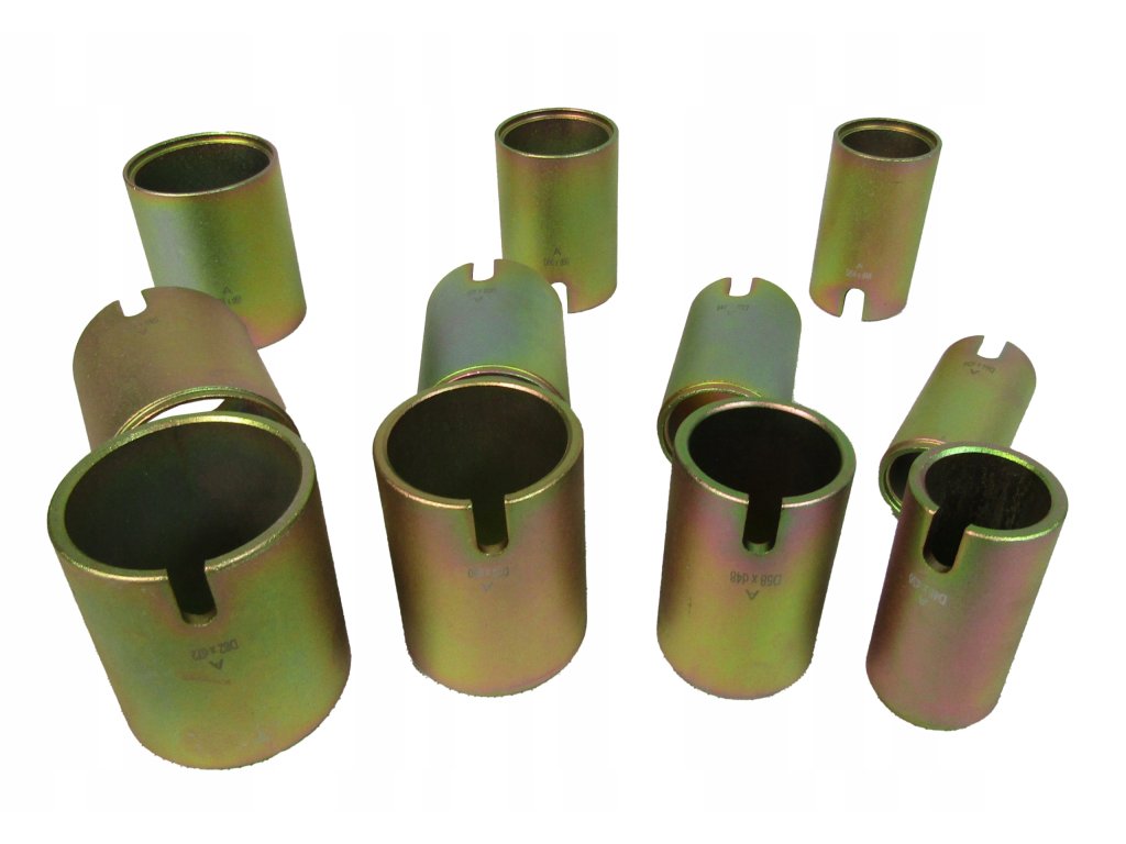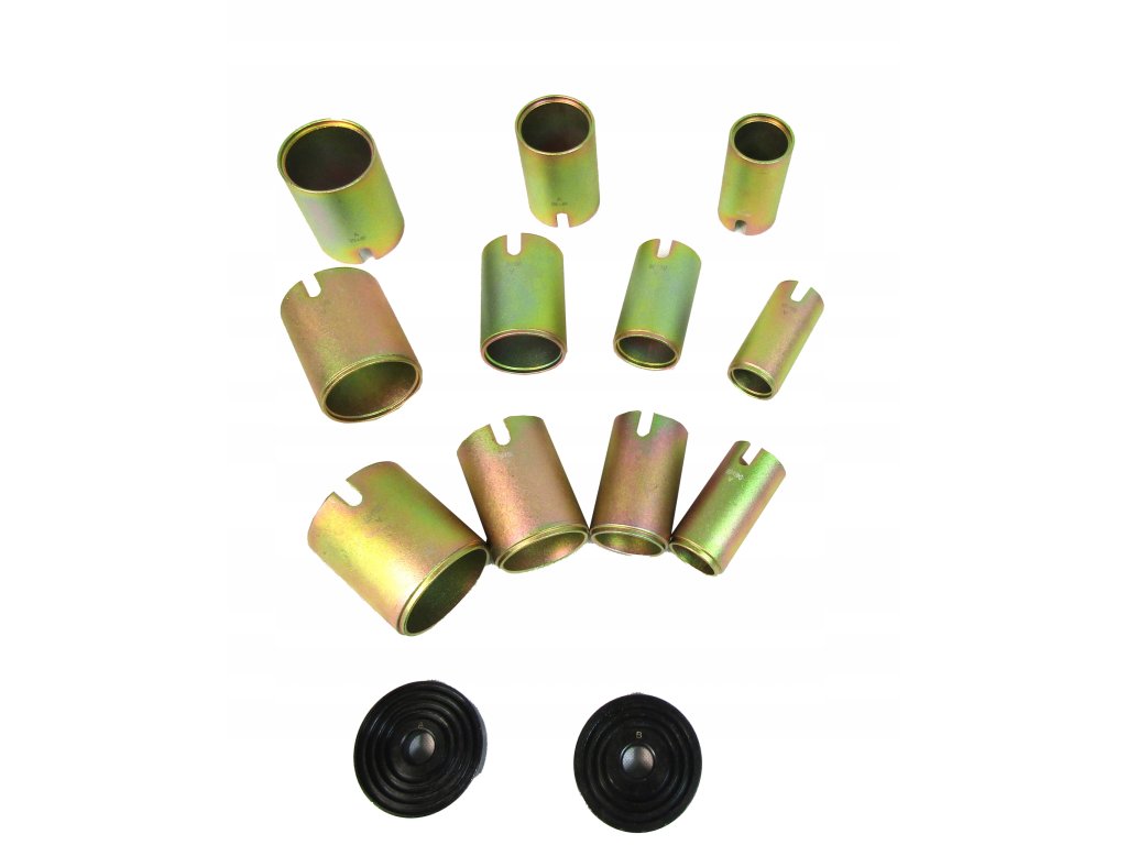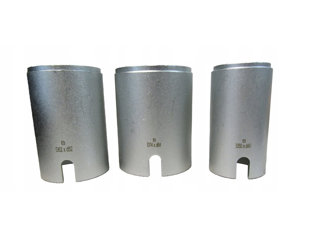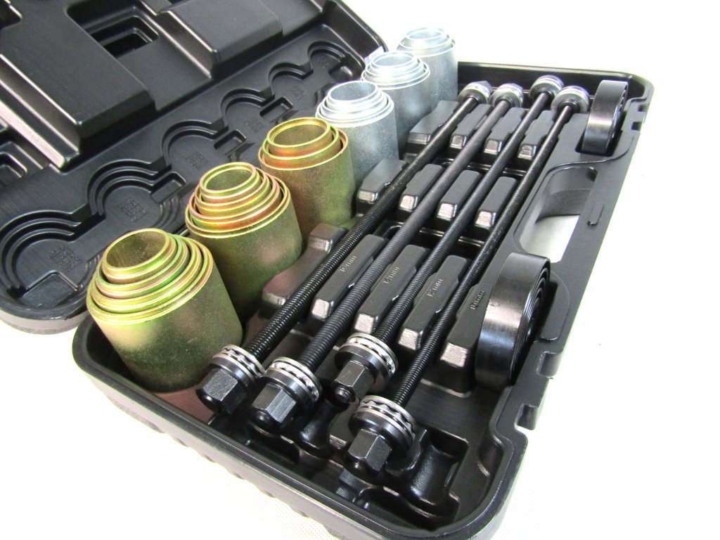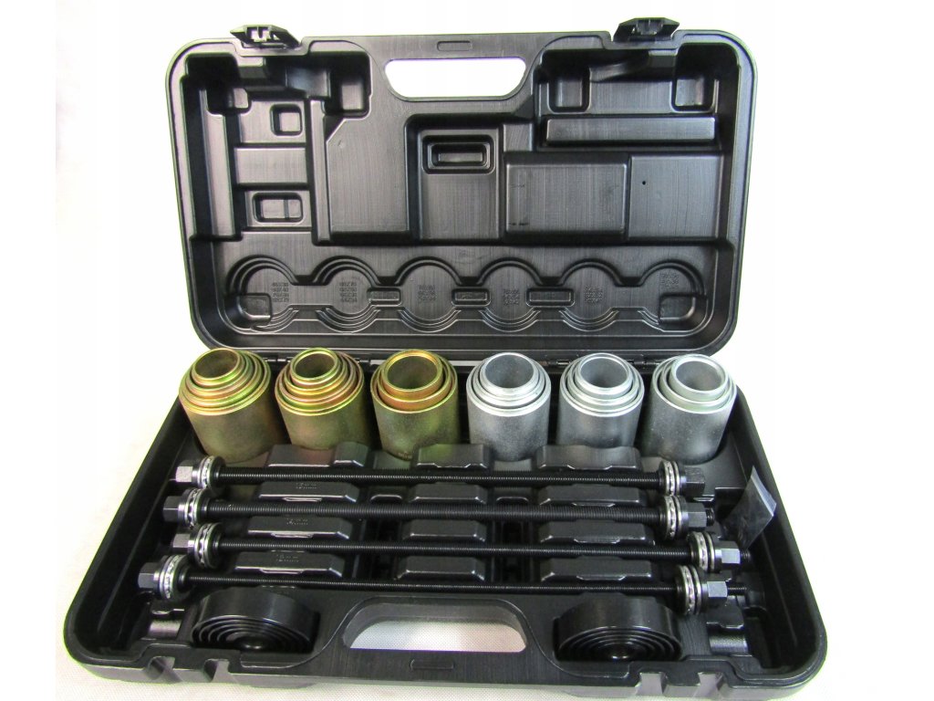 Комплект за запресоване/избиване на метално-гумени втулки на автомобил, без да е необходимо разглобяване на рамената. Комплектът може да се използва с хидравлична преса или с помощта на проходен теглещ цилиндър.
