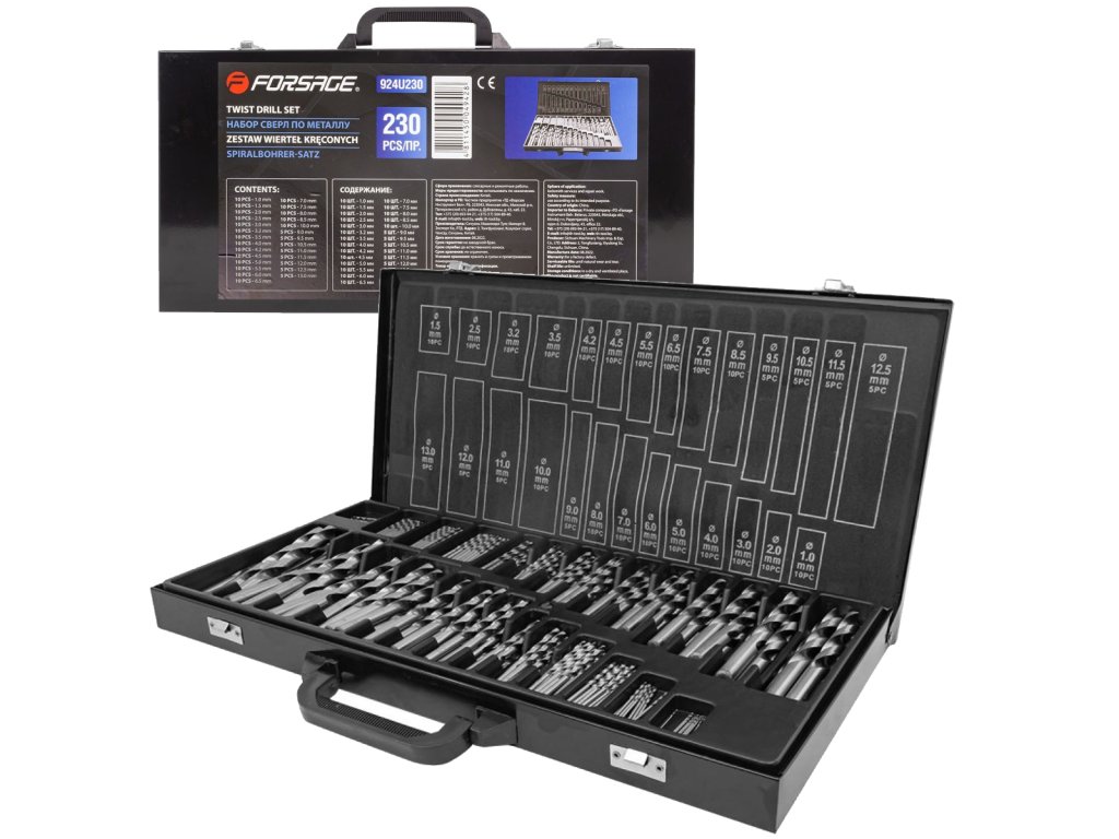 - 10 x свредло 1 / 1,5 / 2 / 2,5 / 3 / 3,2 / 3,5 / 4 / 4,2 / 4,5 / 5 / 5,5 / 6 / 6,5 / 7 / 7,5 / 8 / 8,5 / 10 мм