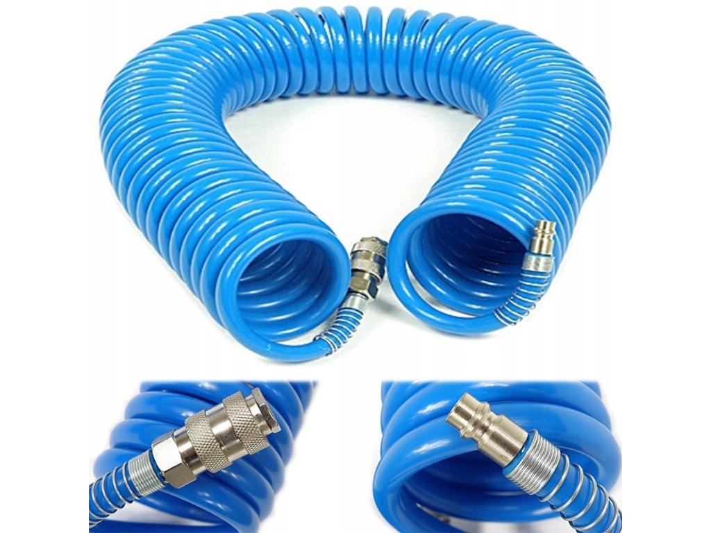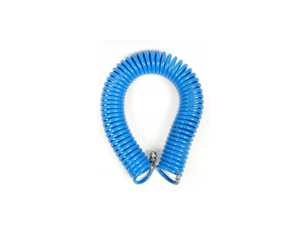 Висококачествен спирален пневматичен маркуч с дължина 10 м и диаметър 5 x 8 мм, незаменим аксесоар за работа с компресори и пневматични инструменти. Маркучът е оборудван с бързи връзки, които позволяват лесно свързване на различни устройства като манометри, пистолети за почистване, бояджийски пистолети или пневматични ключове. Благодарение на високата си устойчивост на температурни колебания и работно налягане, е идеален за професионална употреба.