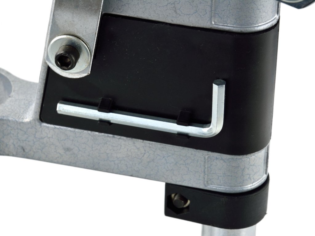Нейната лека и здрава конструкция, комбинирана с удобен лост за управление, осигурява прецизност и лесна работа при всяко използване. Благодарение на универсалното закрепване за бормашина (Euronorm с диаметър 43 мм), в стойката може да се закрепи почти всяка бормашина.