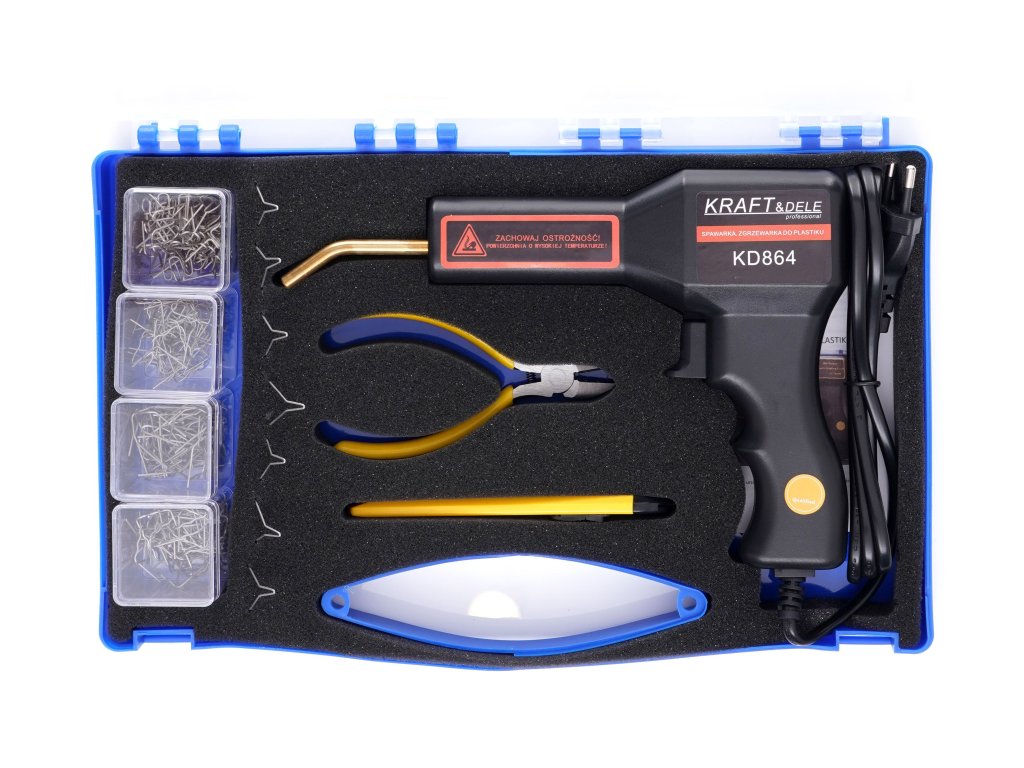 Апарат за свързване/заваряване на пластмаси KD864 от Kraft & Dele е универсална заваръчна машина за пластмаси, предназначена за поправки на пластмасови детайли. Подходяща е както за професионалисти, така и за домашни майстори. Отличен комплект, предназначен за ремонти на пластмасови детайли, заваряване на пластмаси и запечатване на различни пукнатини.