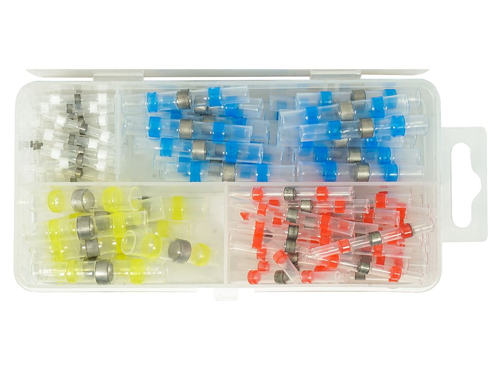 Прозрачна термо-свиваща се тръбичка с калайно пръстенче в средата и два пръстена от термо лепило от двете страни, които допълнително уплътняват съединението. PE свиващи тръбички се използват не само за домашна употреба, но и там, където трябва да се вземат предвид атмосферни фактори като ниски температури или необходимостта от работа в пожароустойчива среда (например в автомобил под горещата каросерия или близо до двигателя). Количеството спояващ материал в термо-свиващите тръбички с калай позволява създаването на правилно споено съединение. Калайът се разтича между проводниците и осигурява здраво и надеждно съединение. Комплектът съдържа 100 броя тръбички.