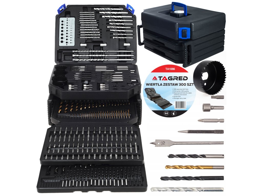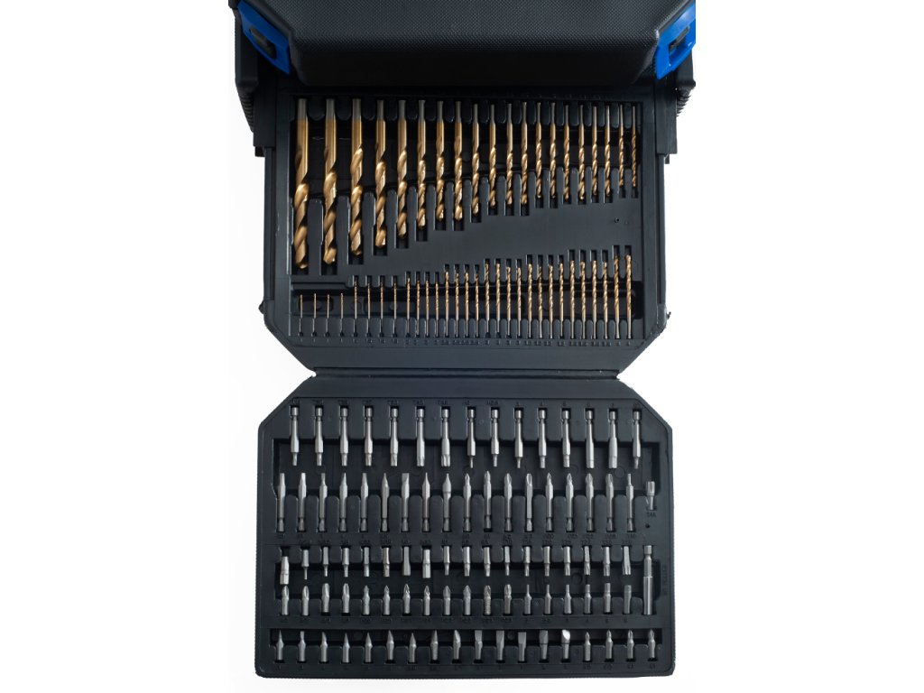 Насладете се на професионален комплект свредла и битове съдържащ 300 елемента! Този комплект включва 5 комплекта свредла предназначени за бетон, метал и дърво, включително пилни свредла и перовидни свредла, всички съхранени в удобен и здрав пластмасов куфар. На шестото отделение се намира специализиран комплект от различни видове битове за отвертки.
