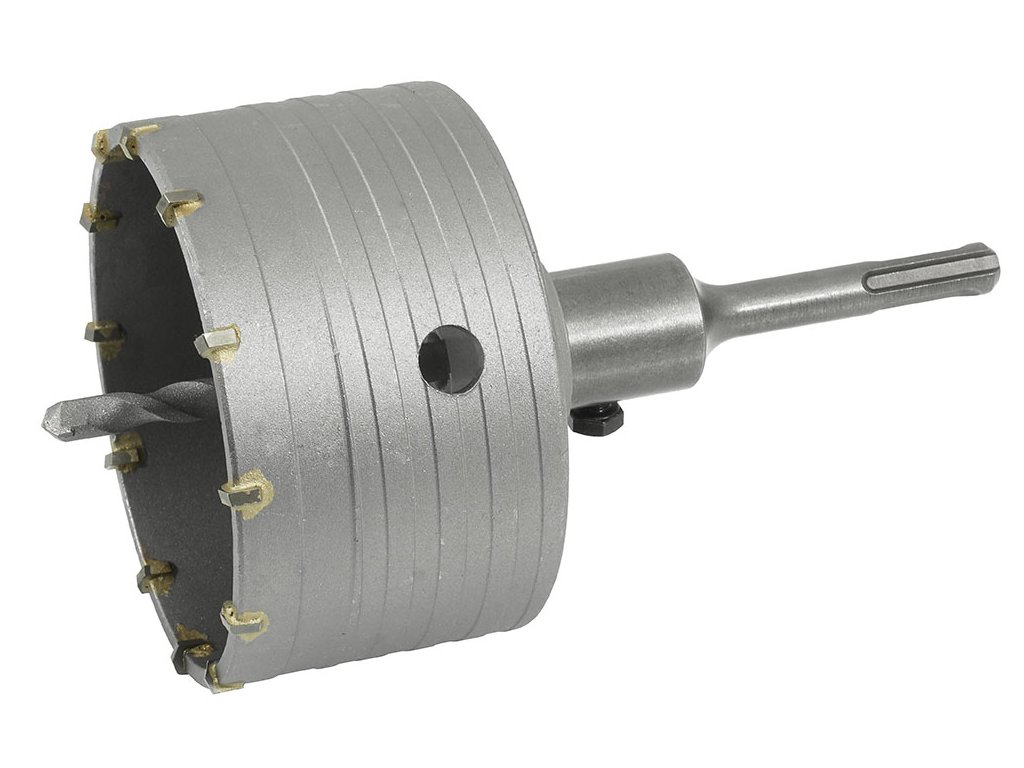 Свредло корона 100 мм SDS+ VERKE V05092. Инструмент оборудван с 12 режещи зъба от волфрамов карбид. Корона с дължина 55 мм и диаметър 100 мм, идеална за пробиване в бетон, тухли, блокчета и перфорирани тухли. Система на захващане SDS+, свързана с свредлото чрез винт. Използването на водещо свредло и допълнителни отвори за отводняване на отпадъци подобрява качеството и удобството при работа.