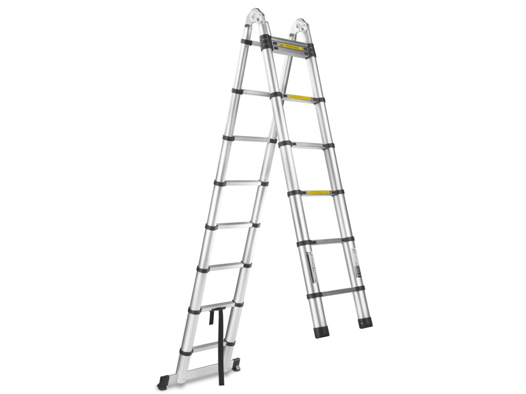 Телескопична алуминиева шарнирна стълба представлява усъвършенствана версия на традиционната телескопична стълба. Благодарение на допълнителния шарнирен механизъм позволява настройка в различни форми и позиции, което я прави изключително универсален инструмент. Телескопичната алуминиева стълба се сгъва и разгъва лесно, позволявайки регулиране на дължината според конкретните нужди. Тази стълба е много компактна и леснопреносима, което улеснява съхранението и транспорта.