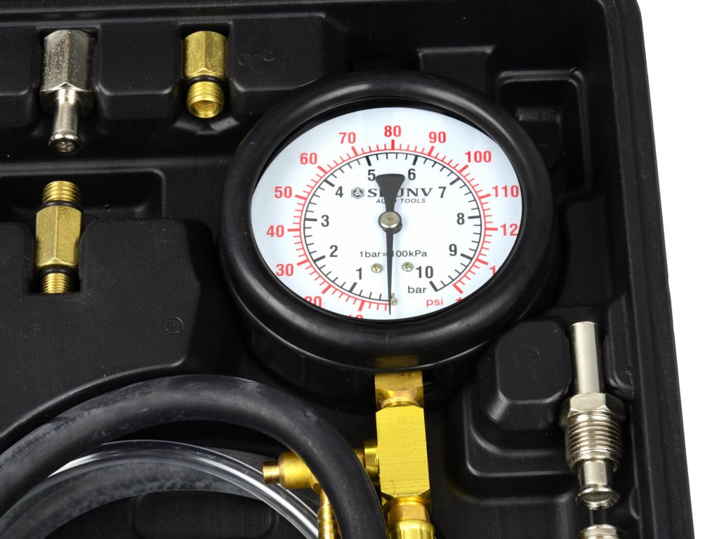 Включени са адаптери и фитинги, пригодени за повечето горивни инжекционни системи. Тестерът разполага с манометър с двойна скала: 0 - 140 psi и 0 - 10 bar. Гъвкавият дълъг маркуч с обезвъздушителен клапан осигурява безопасно измерване на налягането.
