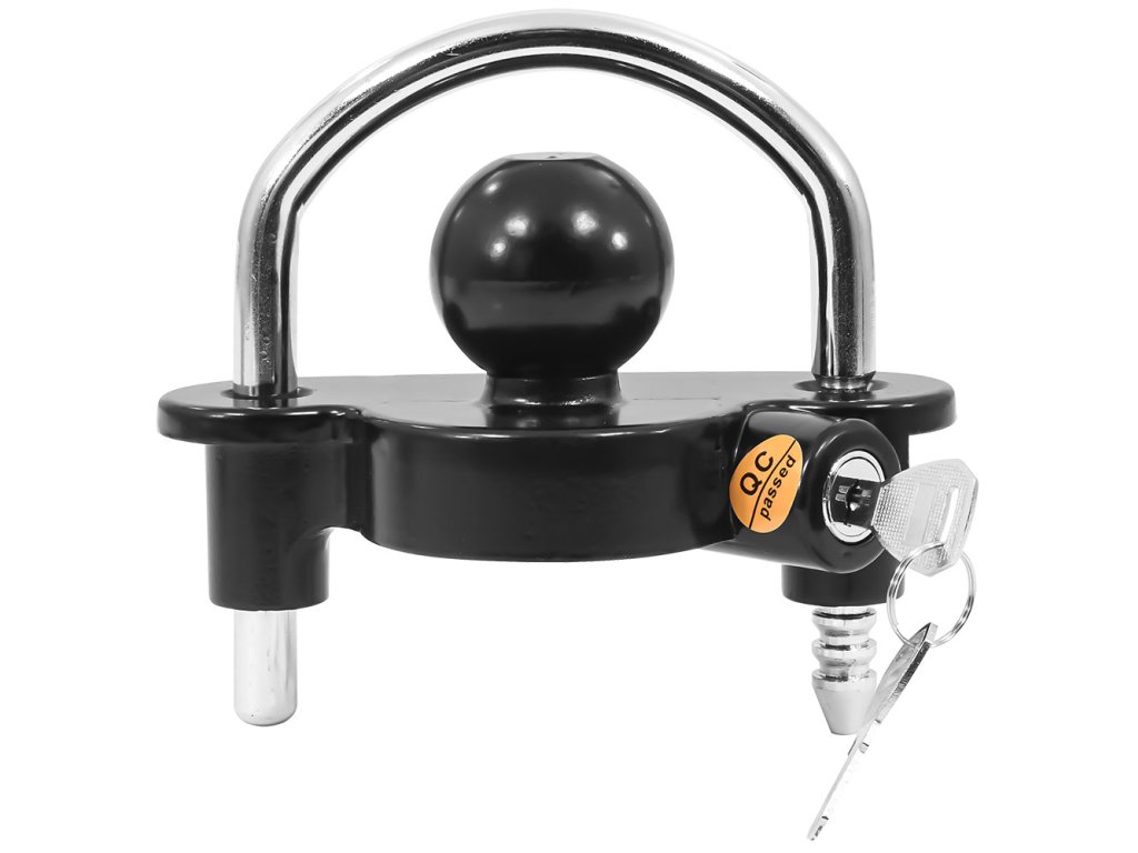 Защита срещу кражба: U-заключване за закрепен кукич. Универсално заключване/сигурност за ремаркета, лодки и къмпинг ремаркета. Поставя се върху топката на ремаркето. В комплекта са включени два ключа.