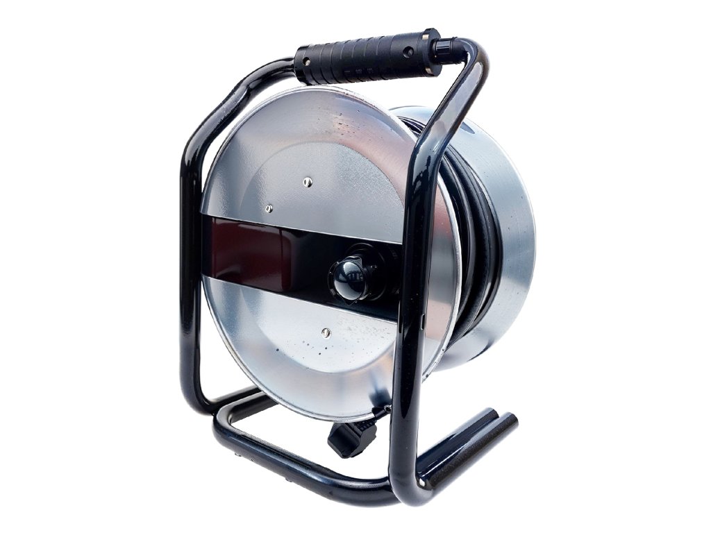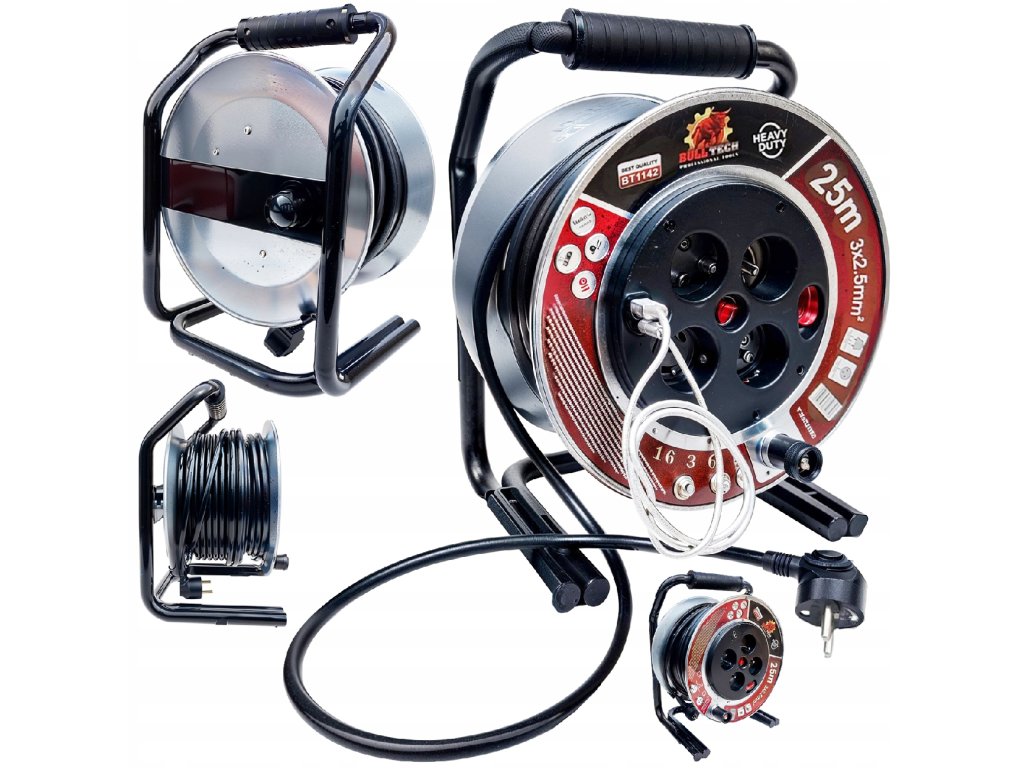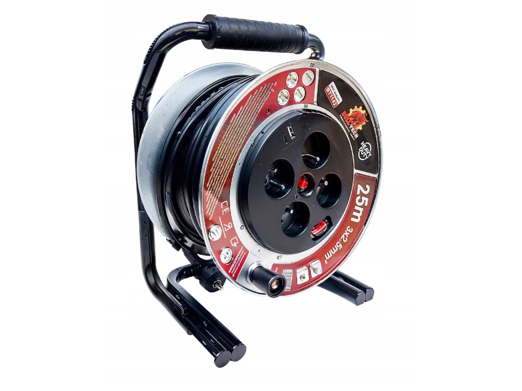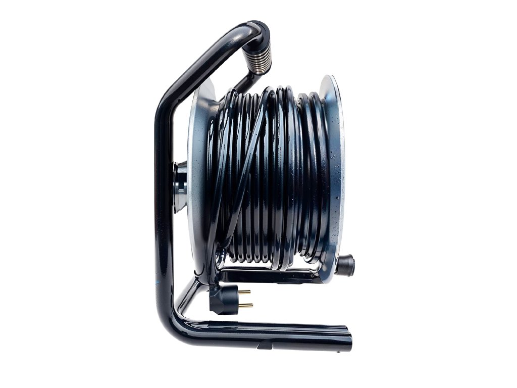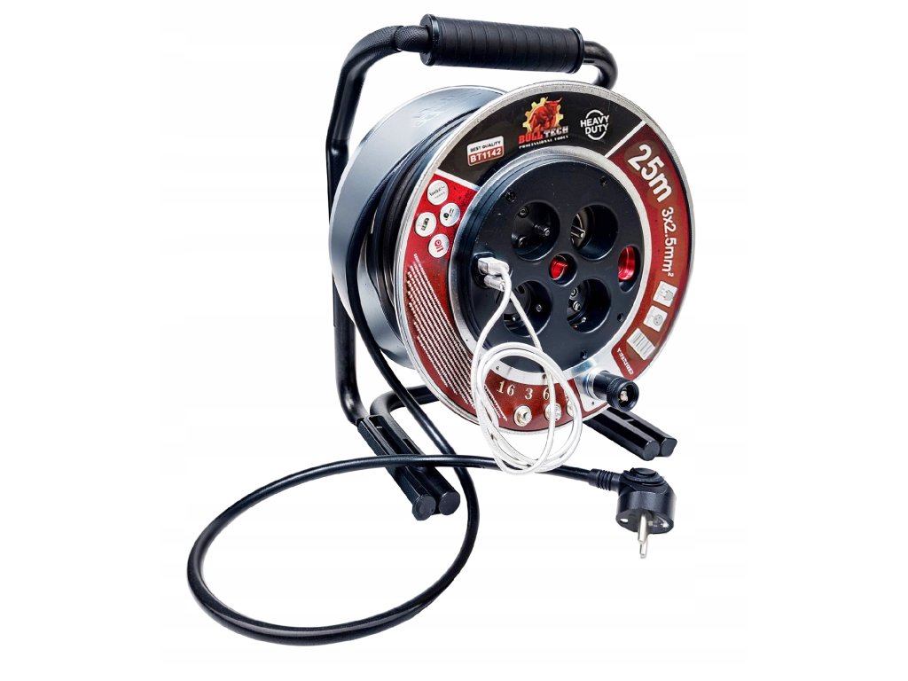 Кабелът е защитен с устойчив PVC слой, проектиран да издържа на тежки механични натоварвания, химически вещества и неблагоприятни атмосферни условия. Металната конструкция на макарата е удароустойчива и гарантира дълъг експлоатационен живот. Удължителят е оборудван с практичен прекъсвач и ръкохватка за лесно боравене.