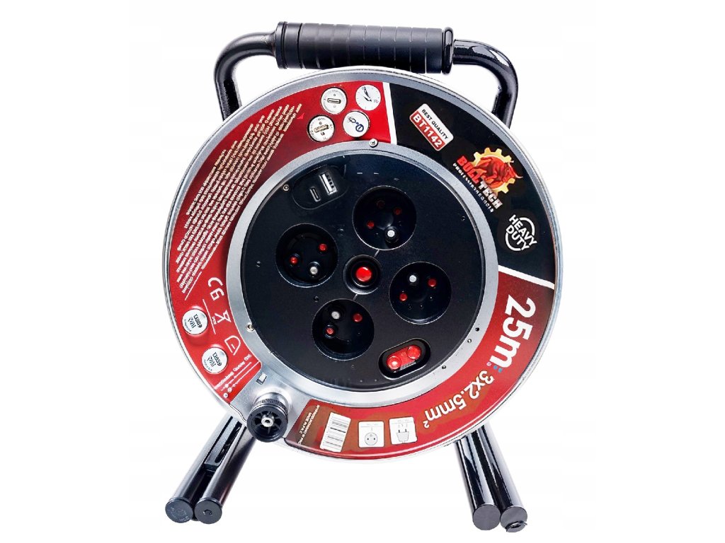 Удължител кабел на макара, метален, 25м, 3x2,5мм² с USB и USB-C е здрав и надежден инструмент, предназначен за тежки условия на строителни обекти, в работилници или в градината. Този удължител разполага с 4 гнезда със защитни капаци и модерни USB и USB-C портове за удобно зареждане на електронни устройства директно от макарата.