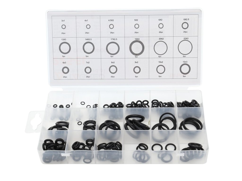 Уплътнителен комплект 225 бр. гумени пръстени, в кутия е перфектното решение за всеки, който се нуждае от водоустойчиво и маслозащитно уплътнение. Тези гумени уплътнения са устойчиви на озон, нефт, минерални масла, смазочни материали и масла с растителен и животински произход. Осигуряват отлична защита и срещу леки отоплителни масла, емулсии масло-вода тип HSA, HSB, алифатни въглеводороди като бензин и пропан-бутан, както и срещу разредени киселини, основи и соли (дори при повишени температури).