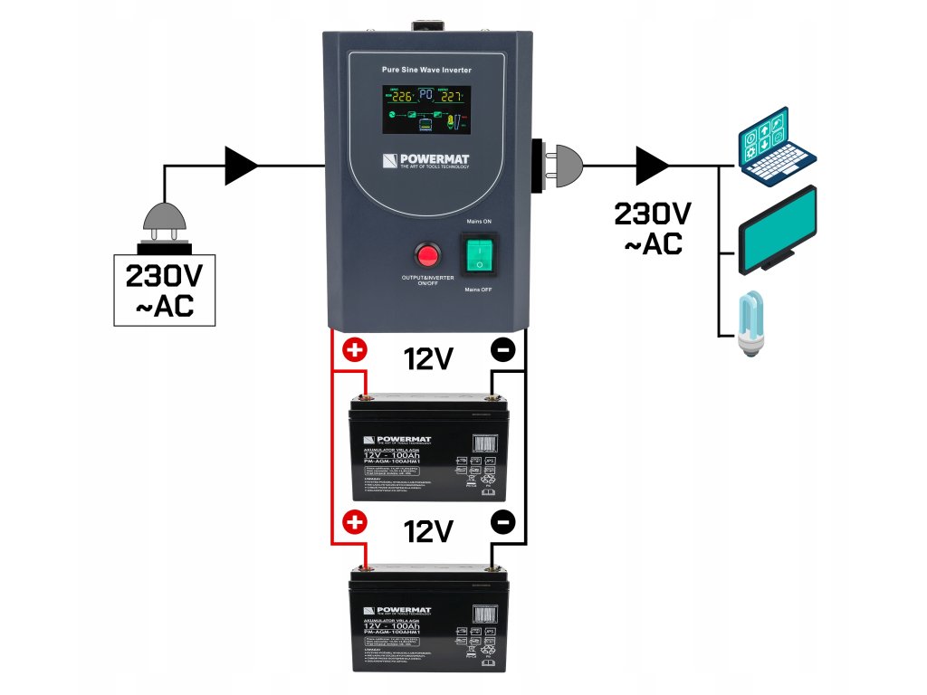 - UPS устройството от марката POWERMAT предлага отлично решение на този проблем. Позволява свързване на външна батерия или батерийни пакети (паралелно) с напрежение 12V и има два изходни контакта с напрежение 230V, което дава възможност за захранване на две устройства едновременно.