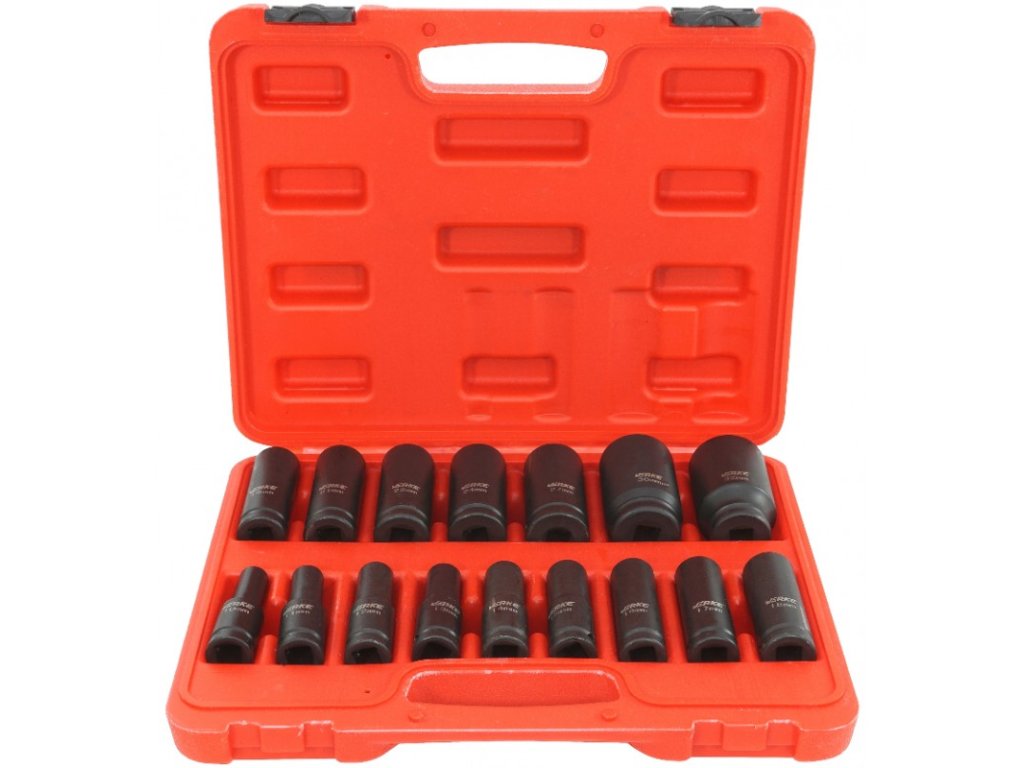 VERKE КОМПЛЕКТ УДАРНИ ВЛОЖКИ 1/2" 10-32ММ V39462 е незаменим инструмент за всеки професионален сервиз и автоработилница. Този комплект включва 16 ударни вложки в различни размери, предназначени за пневматични ключове. Изработени са от висококачествена кована и закалена стомана, което им осигурява здравина и дълъг живот. Благодарение на термичната обработка е намалена чупливостта на материала и е постигната подходяща твърдост – отличават се с устойчивост на механични повреди и корозия. Вложките са ясно маркирани с размерите си за лесна идентификация. Комплектът се предлага в практичен и удобен куфар.
