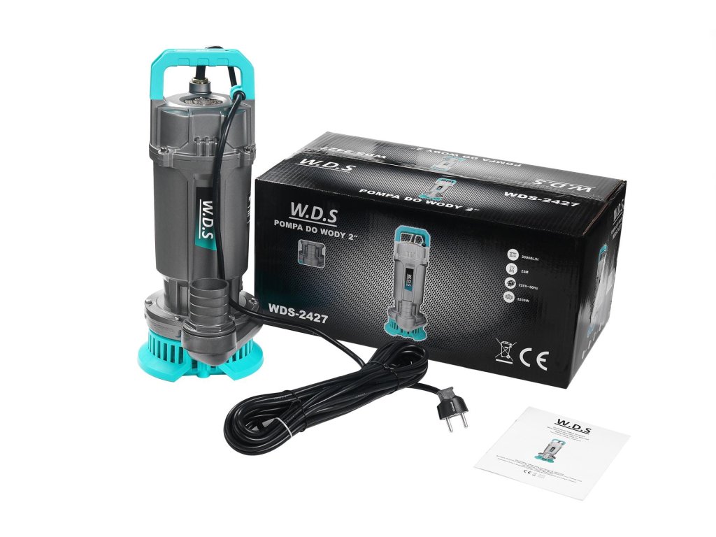 Професионална потопяема водна помпа на марка W.D.S., модел WDS2427, за чиста и замърсена вода. Устройството е оборудвано с двигател с мощност 3200 W, което значително повишава ефективността му. Устройството може да изпомпва 30 000 литра вода на час.